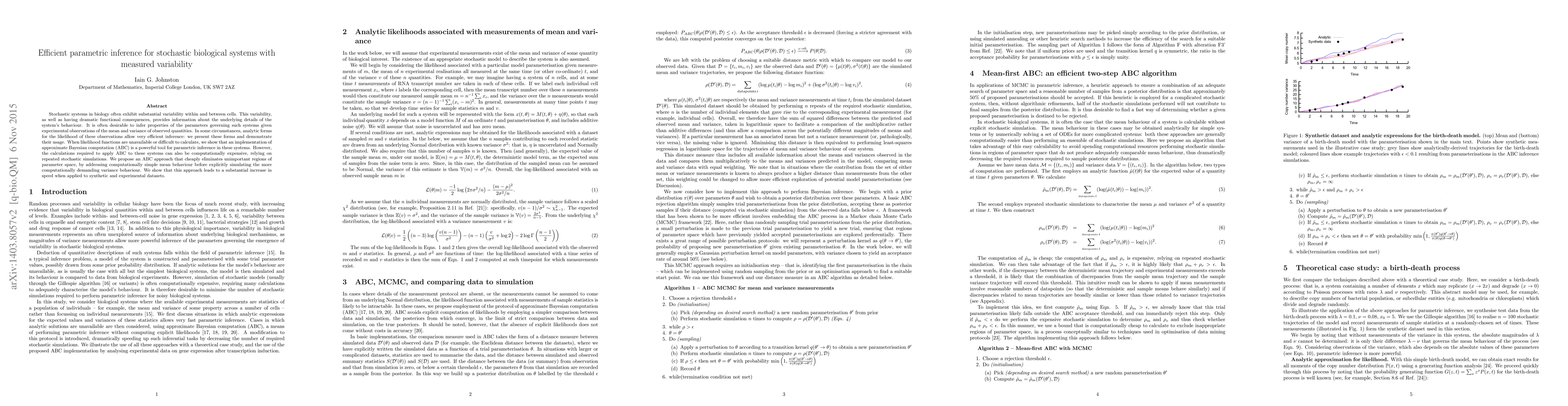 Stochastic systems in biology often exhibit substantial variability within and between cells. This variability, as well as having dramatic functional consequences, provides information about the underlying details of the system's behaviour. It is often desirable to infer properties of the parameters governing such systems given experimental observations of the mean and variance of observed quantities. In some circumstances, analytic forms for the likelihood of these observations allow very efficient inference: we present these forms and demonstrate their usage. When likelihood functions are unavailable or difficult to calculate, we show that an implementation of approximate Bayesian computation (ABC) is a powerful tool for parametric inference in these systems. However, the calculations required to apply ABC to these systems can also be computationally expensive, relying on repeated stochastic simulations. We propose an ABC approach that cheaply eliminates unimportant regions of parameter space, by addressing computationally simple mean behaviour before explicitly simulating the more computationally demanding variance behaviour. We show that this approach leads to a substantial increase in speed when applied to synthetic and experimental datasets.