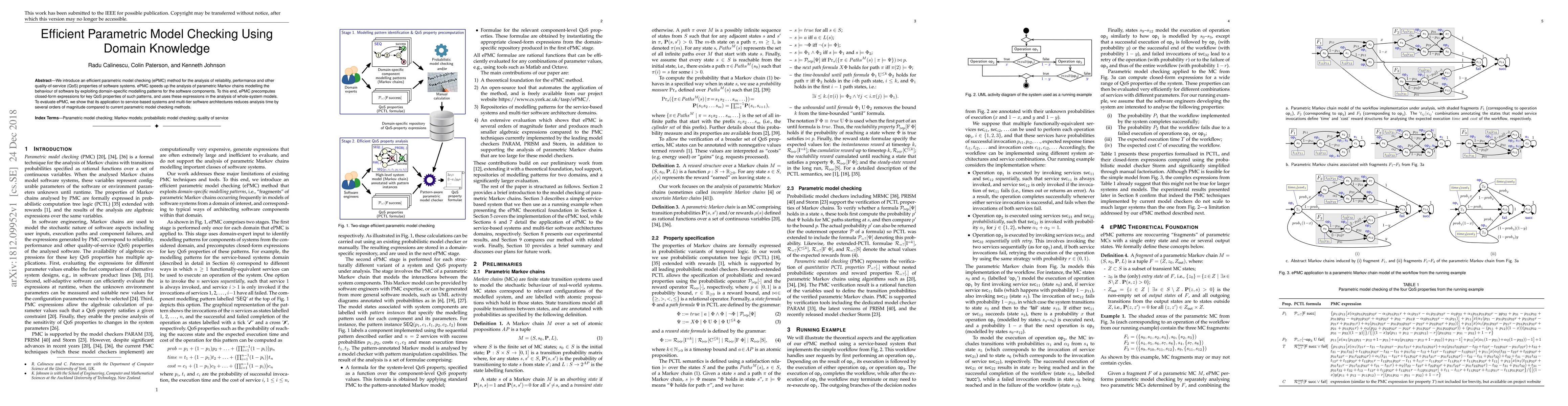This paper presents an efficient parametric model checking (ePMC) method that leverages domain-specific modelling patterns to significantly speed up the analysis of software systems' reliability and performance. ePMC precomputes closed-form expressions for key properties, reducing analysis time by orders of magnitude compared to existing methods.