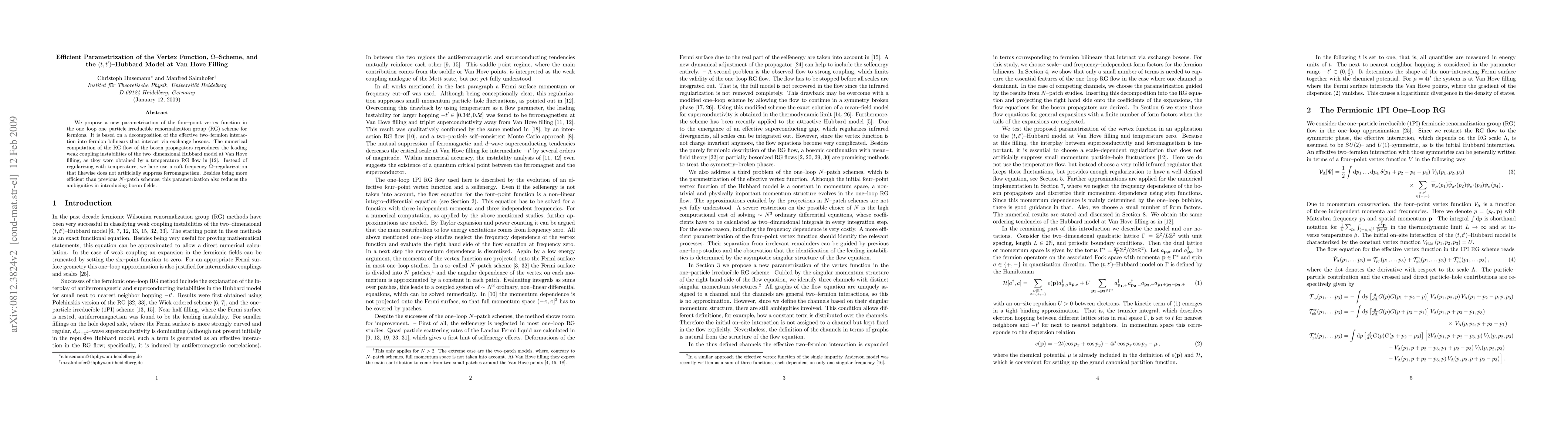 This paper introduces a new parametrization of the four-point vertex function in the one-loop one-particle irreducible RG scheme, decomposing the effective two-fermion interaction into fermion bilinears. This method efficiently reproduces the leading weak coupling instabilities of the 2D Hubbard model at Van Hove filling without suppressing ferromagnetism, using a soft frequency $\Omega$-regularization.