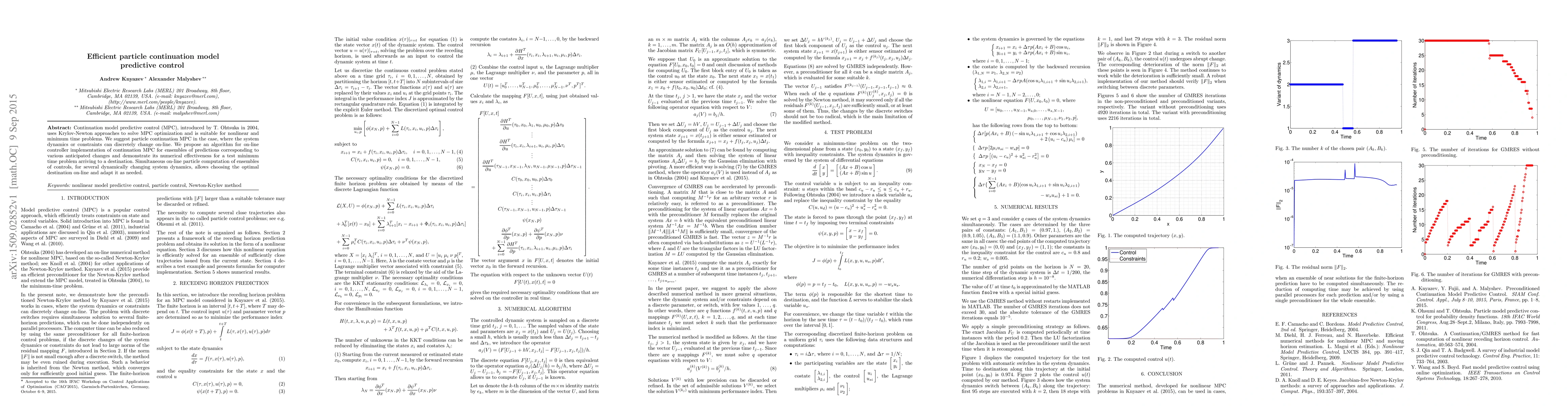 Continuation model predictive control (MPC), introduced by T. Ohtsuka in 2004, uses Krylov-Newton approaches to solve MPC optimization and is suitable for nonlinear and minimum time problems. We suggest particle continuation MPC in the case, where the system dynamics or constraints can discretely change on-line. We propose an algorithm for on-line controller implementation of continuation MPC for ensembles of predictions corresponding to various anticipated changes and demonstrate its numerical effectiveness for a test minimum time problem arriving to a destination. Simultaneous on-line particle computation of ensembles of controls, for several dynamically changing system dynamics, allows choosing the optimal destination on-line and adapt it as needed.