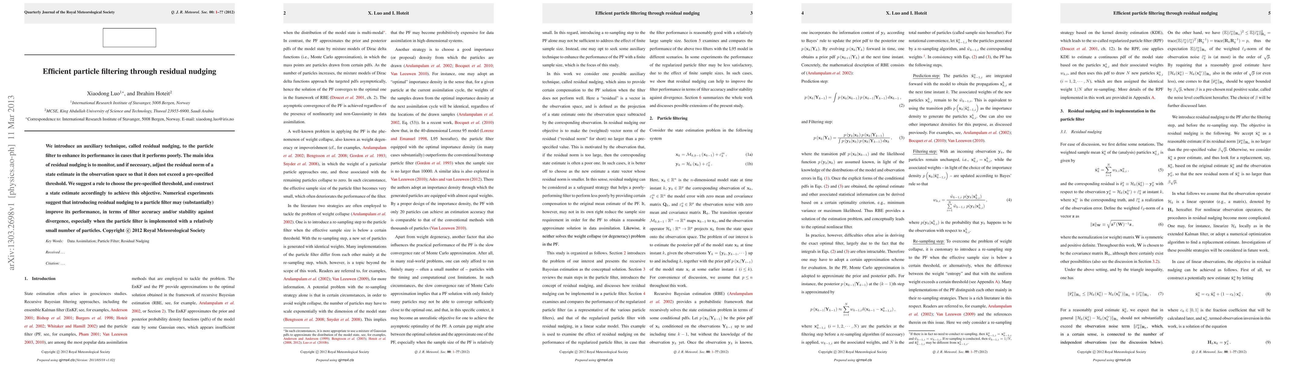 This paper proposes residual nudging to enhance particle filter performance, particularly in scenarios where the filter struggles. The technique adjusts the residual norm of state estimates to maintain accuracy and stability, especially with limited particles, as shown by improved filter accuracy and stability in numerical experiments.