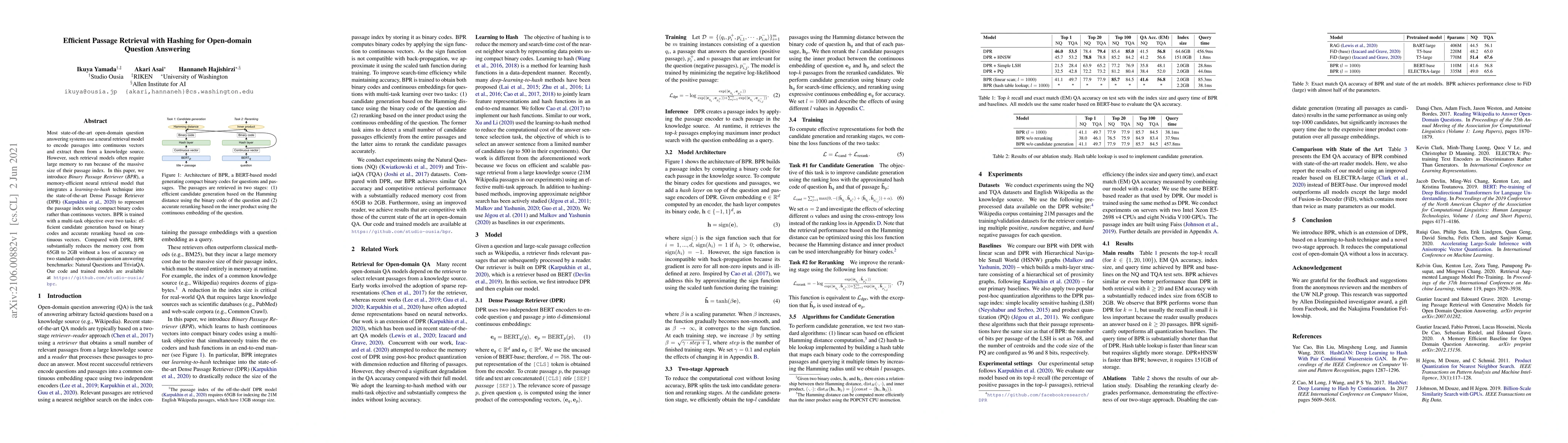 This paper introduces the Binary Passage Retriever (BPR), a memory-efficient neural model for open-domain question answering that uses learning-to-hash to reduce memory usage from 65GB to 2GB while maintaining accuracy on Natural Questions and TriviaQA benchmarks. BPR combines binary code generation and continuous vector reranking for efficient passage retrieval.
