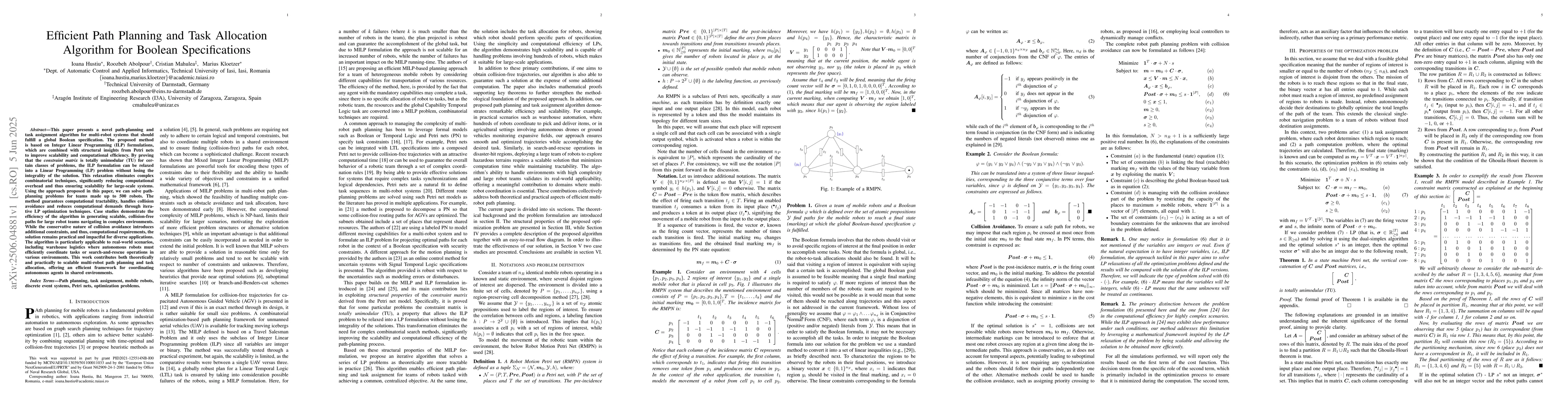 This paper presents a novel path-planning and task assignment algorithm for multi-robot systems that should fulfill a global Boolean specification. The proposed method is based on Integer Linear Programming (ILP) formulations, which are combined with structural insights from Petri nets to improve scalability and computational efficiency. By proving that the \emph{constraint matrix} is totally unimodular (TU) for certain classes of problems, the ILP formulation can be relaxed into a Linear Programming (LP) problem without losing the integrality of the solution. This relaxation eliminates complex combinatorial techniques, significantly reducing computational overhead and thus ensuring scalability for large-scale systems. Using the approach proposed in this paper, we can solve path-planning problems for teams made up to 500 robots. The method guarantees computational tractability, handles collision avoidance and reduces computational demands through iterative LP optimization techniques. Case studies demonstrate the efficiency of the algorithm in generating scalable, collision-free paths for large robot teams navigating in complex environments. While the conservative nature of collision avoidance introduces additional constraints, and thus, computational requirements, the solution remains practical and impactful for diverse applications. The algorithm is particularly applicable to real-world scenarios, including warehouse logistics where autonomous robots must efficiently coordinate tasks or search-and-rescue operations in various environments. This work contributes both theoretically and practically to scalable multi-robot path planning and task allocation, offering an efficient framework for coordinating autonomous agents in shared environments.