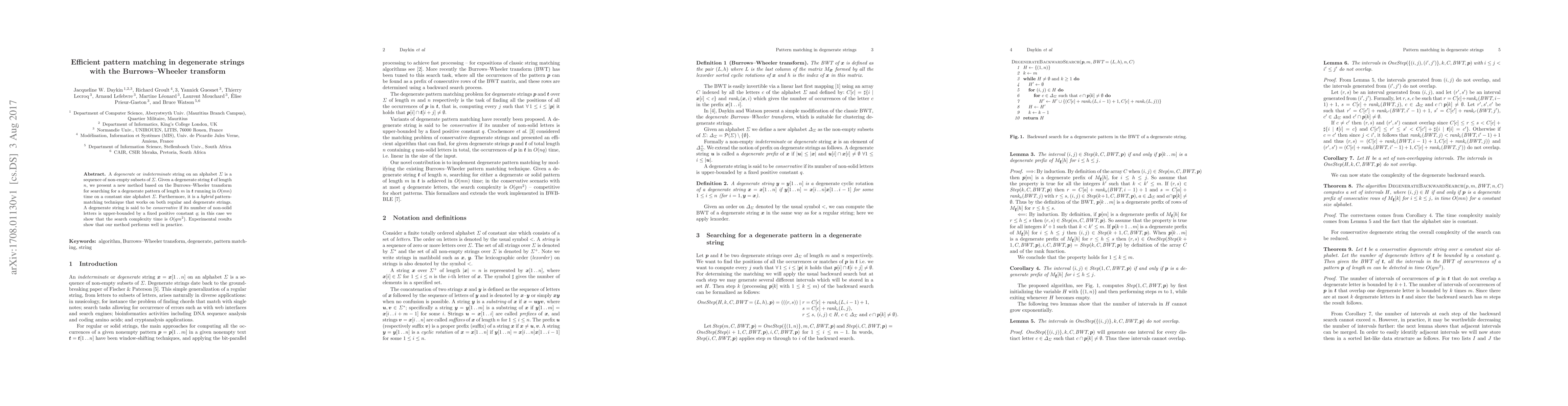 This paper introduces a new method for efficient pattern matching in degenerate strings using the Burrows-Wheeler transform, achieving $O(mn)$ time complexity for general degenerate strings and $O(qm^2)$ for conservative ones. The technique is also effective for regular strings.