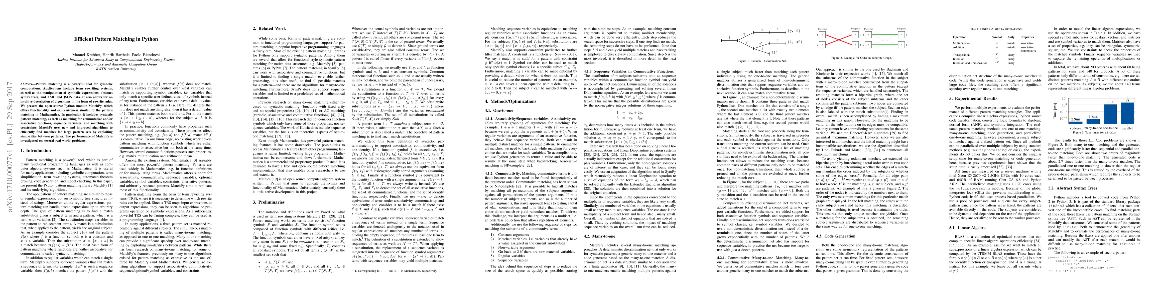 The paper introduces MatchPy, an open-source Python module for efficient pattern matching, offering features akin to Mathematica's pattern matching, including syntactic patterns, commutative/associative functions, and matching with constraints. Performance evaluations demonstrate its efficiency in handling large pattern sets.