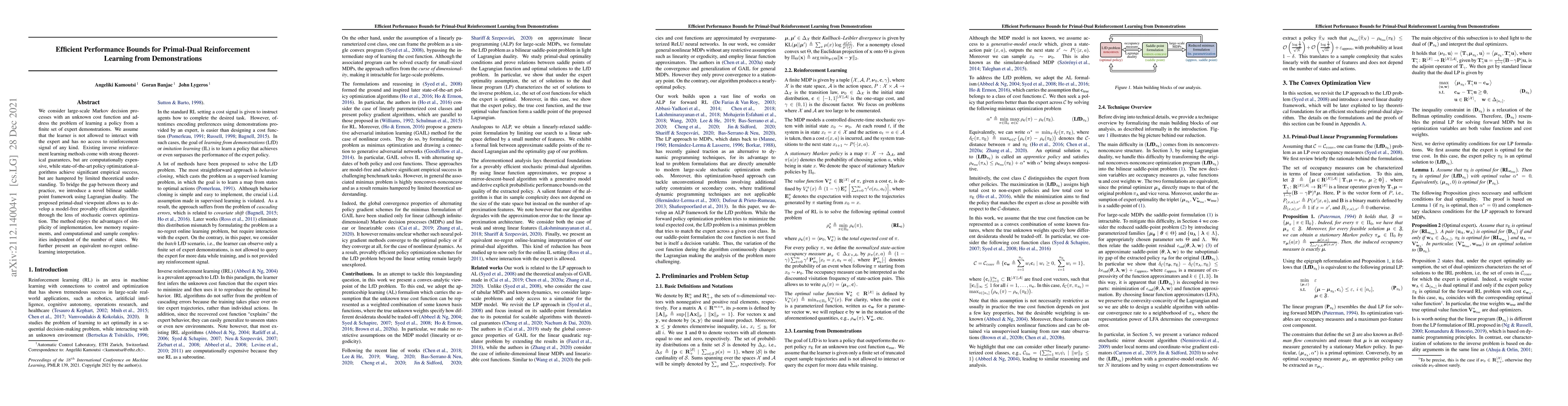 This paper introduces a novel primal-dual reinforcement learning framework for learning policies from expert demonstrations without interaction, leveraging Lagrangian duality for efficient performance bounds. The proposed method offers simplicity, low memory, and independent computational complexity, bridging the gap between theoretical guarantees and practical success.
