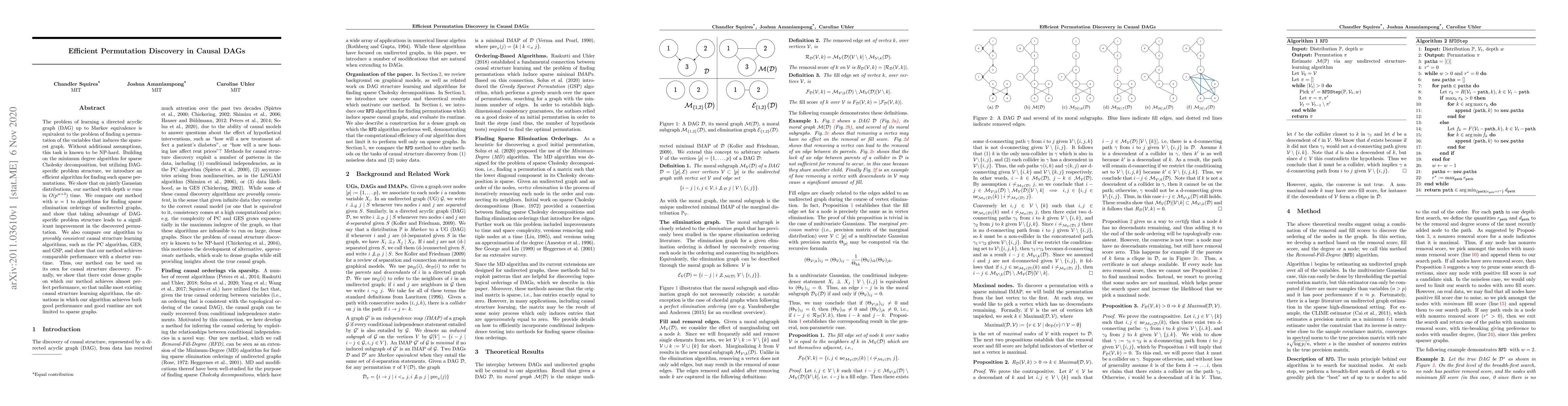 The problem of learning a directed acyclic graph (DAG) up to Markov equivalence is equivalent to the problem of finding a permutation of the variables that induces the sparsest graph. Without additional assumptions, this task is known to be NP-hard. Building on the minimum degree algorithm for sparse Cholesky decomposition, but utilizing DAG-specific problem structure, we introduce an efficient algorithm for finding such sparse permutations. We show that on jointly Gaussian distributions, our method with depth $w$ runs in $O(p^{w+3})$ time. We compare our method with $w = 1$ to algorithms for finding sparse elimination orderings of undirected graphs, and show that taking advantage of DAG-specific problem structure leads to a significant improvement in the discovered permutation. We also compare our algorithm to provably consistent causal structure learning algorithms, such as the PC algorithm, GES, and GSP, and show that our method achieves comparable performance with a shorter runtime. Thus, our method can be used on its own for causal structure discovery. Finally, we show that there exist dense graphs on which our method achieves almost perfect performance, so that unlike most existing causal structure learning algorithms, the situations in which our algorithm achieves both good performance and good runtime are not limited to sparse graphs.
