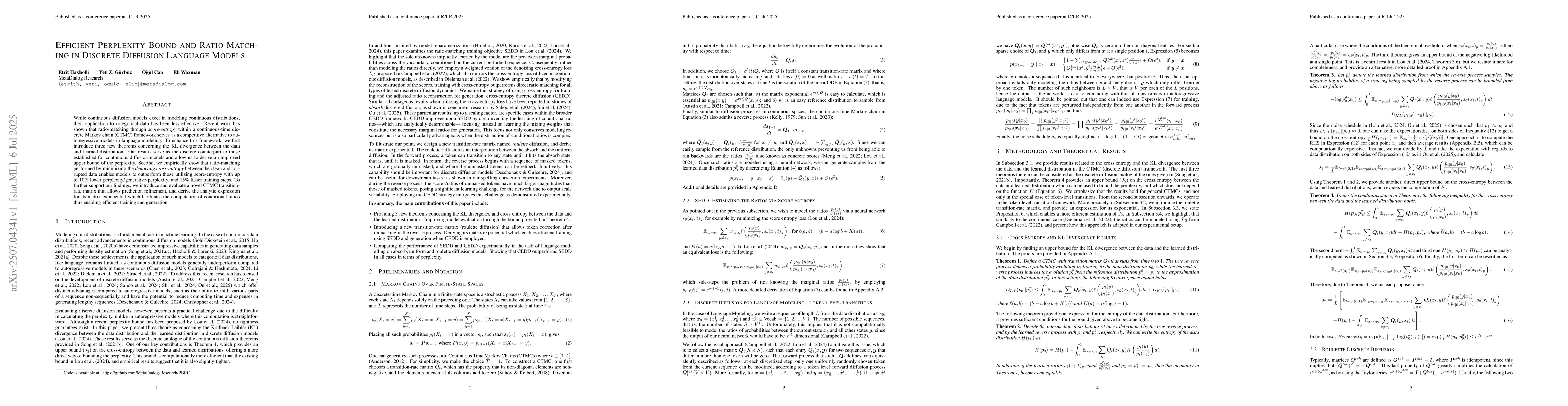 While continuous diffusion models excel in modeling continuous distributions, their application to categorical data has been less effective. Recent work has shown that ratio-matching through score-entropy within a continuous-time discrete Markov chain (CTMC) framework serves as a competitive alternative to autoregressive models in language modeling. To enhance this framework, we first introduce three new theorems concerning the KL divergence between the data and learned distribution. Our results serve as the discrete counterpart to those established for continuous diffusion models and allow us to derive an improved upper bound of the perplexity. Second, we empirically show that ratio-matching performed by minimizing the denoising cross-entropy between the clean and corrupted data enables models to outperform those utilizing score-entropy with up to 10% lower perplexity/generative-perplexity, and 15% faster training steps. To further support our findings, we introduce and evaluate a novel CTMC transition-rate matrix that allows prediction refinement, and derive the analytic expression for its matrix exponential which facilitates the computation of conditional ratios thus enabling efficient training and generation.