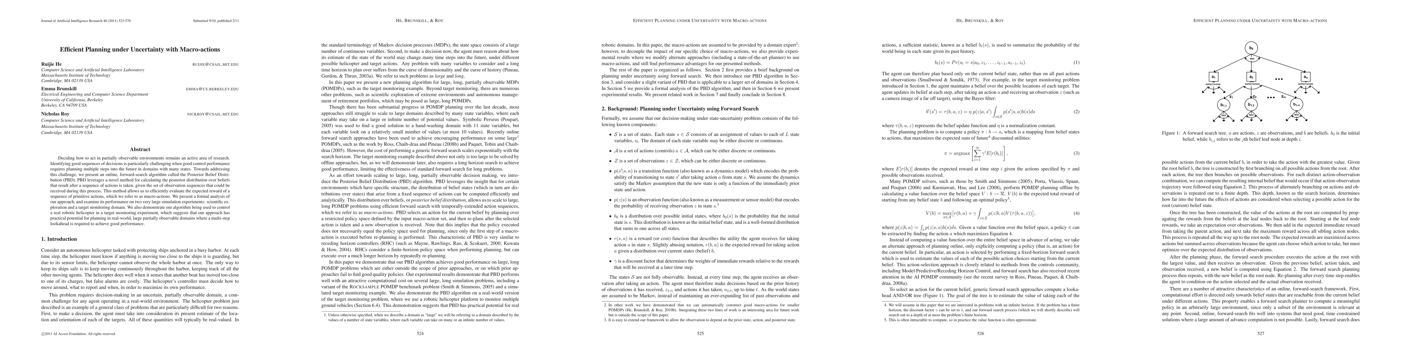 This paper introduces an online forward-search algorithm called PBD for efficient planning under uncertainty using macro-actions. PBD calculates the posterior distribution over beliefs to evaluate expected rewards of action sequences, demonstrating effectiveness in simulation and real-world robotic control scenarios.