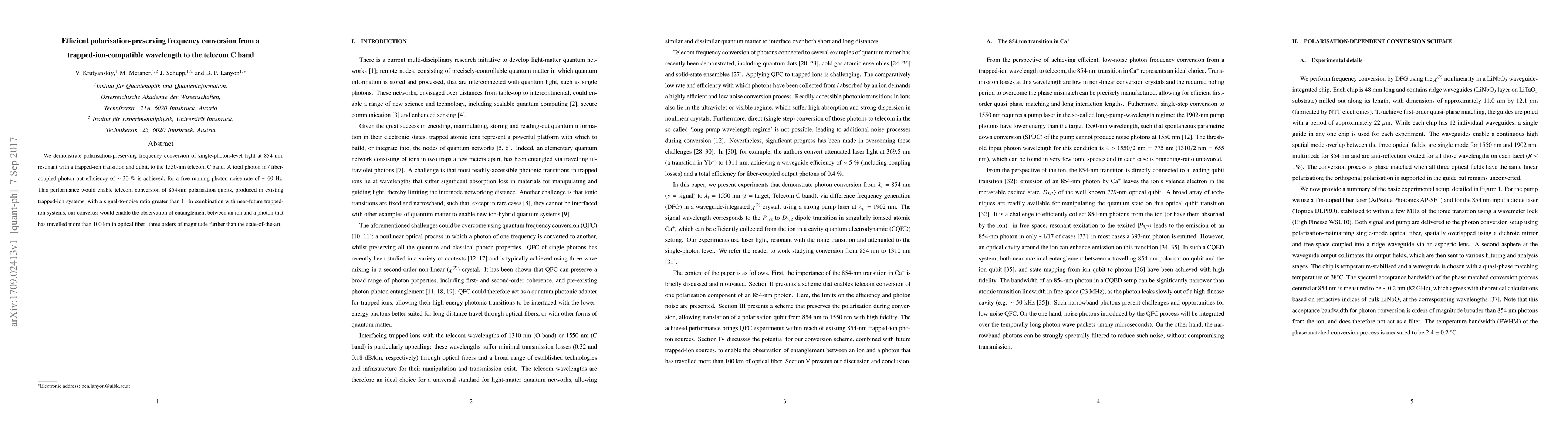 This paper presents a method for efficient polarisation-preserving frequency conversion of single-photon-level light from 854 nm to the 1550-nm telecom C band, achieving a photon conversion efficiency of around 30%. This conversion enables enhanced signal-to-noise ratio for trapped-ion qubits and potential for long-distance entanglement observations via optical fiber.