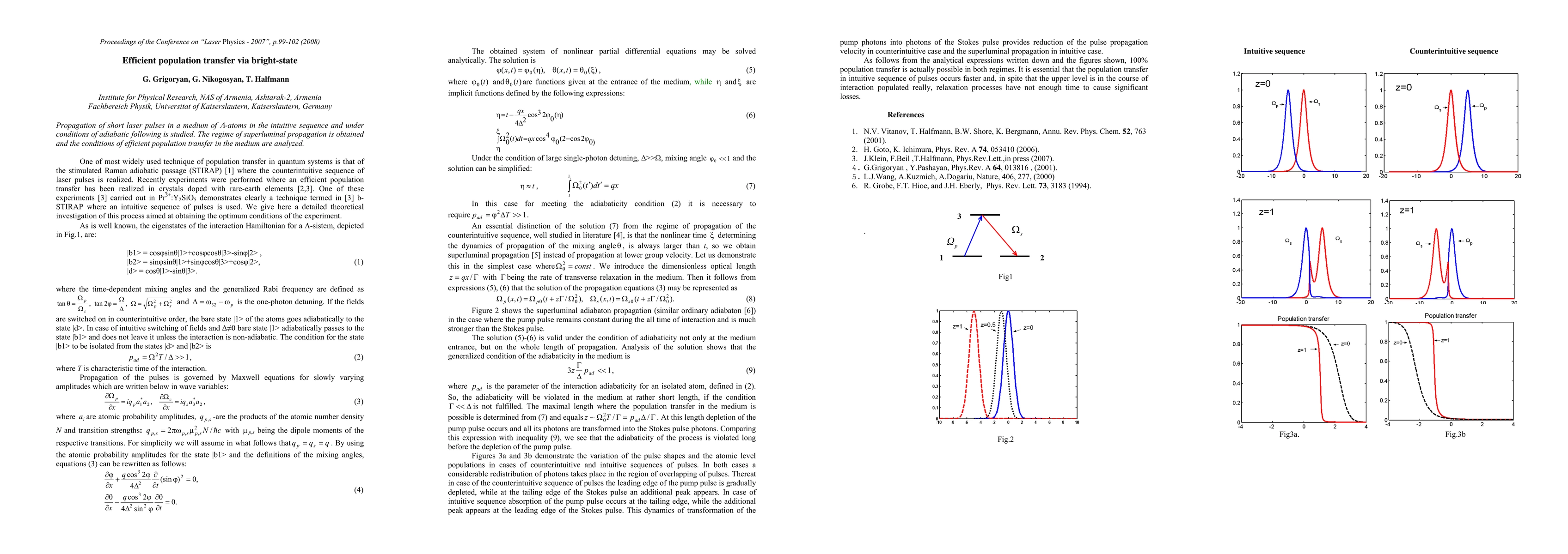 Researchers studied how short laser pulses travel through a medium of Lambda-atoms and found conditions for efficient population transfer, enabling superluminal propagation.