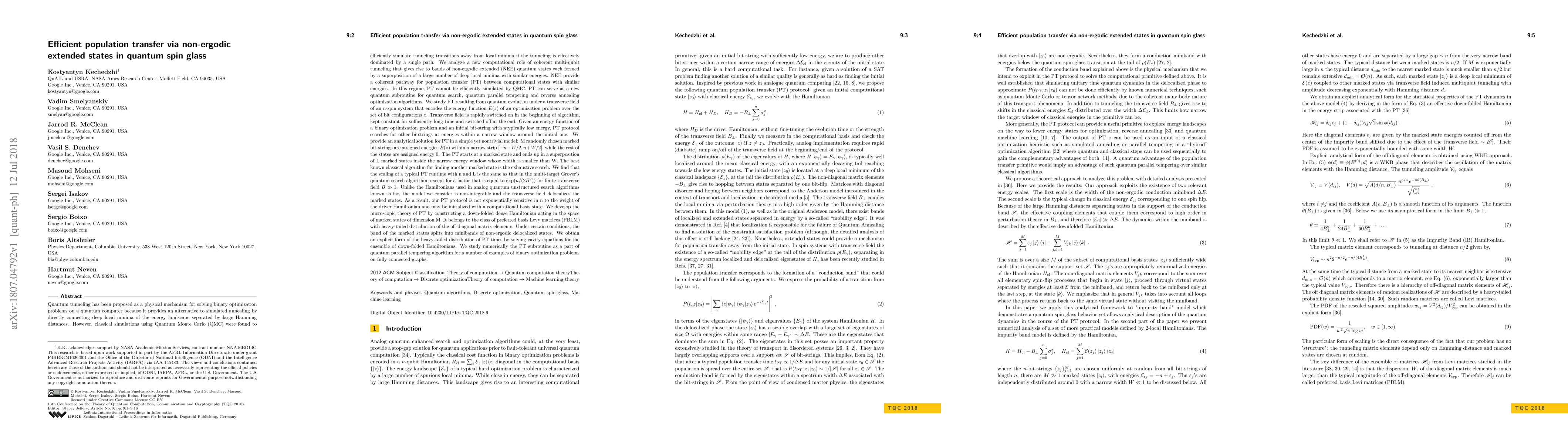 We analyze a new computational role of coherent multi-qubit quantum tunneling that gives rise to bands of non-ergodic extended (NEE) quantum states each formed by a superposition of a large number of computational states (deep local minima of the energy landscape) with similar energies. NEE provide a mechanism for population transfer (PT) between computational states and therefore can serve as a new quantum subroutine for quantum search, quantum parallel tempering and reverse annealing optimization algorithms. We study PT in a quantum n-spin system subject to a transverse field where the energy function $E(z)$ encodes a classical optimization problem over the set of spin configurations $z$. Given an initial spin configuration with low energy, PT protocol searches for other bitstrings at energies within a narrow window around the initial one. We provide an analytical solution for PT in a simple yet nontrivial model: $M$ randomly chosen marked bit-strings are assigned energies $E(z)$ within a narrow strip $[-n -W/2, n + W/2]$, while the rest of the states are assigned energy 0. We find that the scaling of a typical PT runtime with n and L is the same as that in the multi-target Grover's quantum search algorithm, except for a factor that is equal to $\exp(n /(2B^2))$ for finite transverse field $B\gg1$. Unlike the Hamiltonians used in analog quantum unstructured search algorithms known so far, the model we consider is non-integrable and population transfer is not exponentially sensitive in n to the weight of the driver Hamiltonian. We study numerically the PT subroutine as a part of quantum parallel tempering algorithm for a number of examples of binary optimization problems on fully connected graphs.