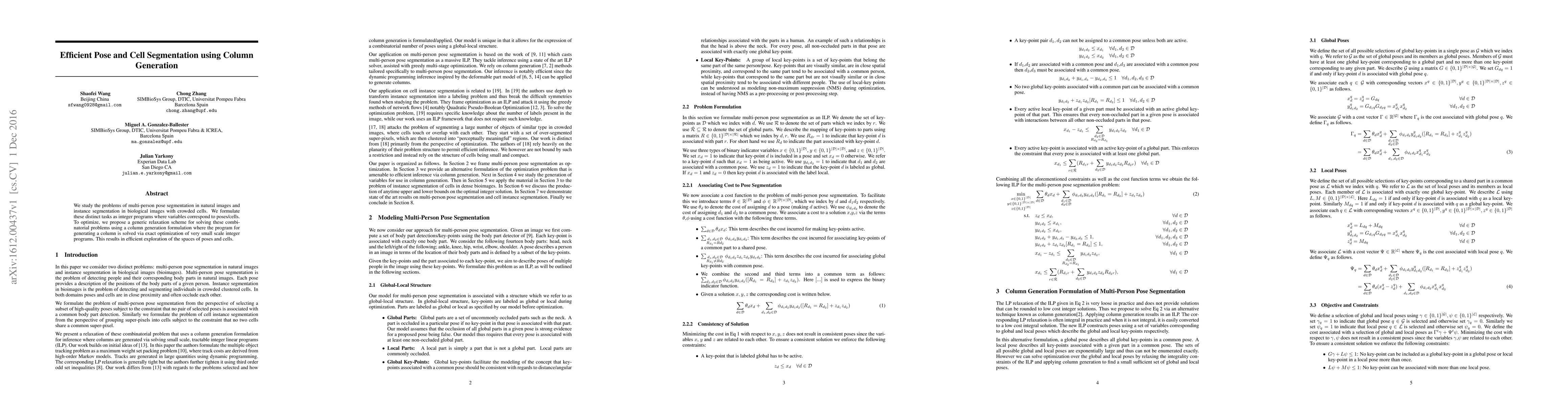 This paper proposes a column generation method for efficiently solving integer programs to perform multi-person pose segmentation in natural images and instance segmentation in crowded biological cell images. The method uses exact optimization of small-scale integer programs to generate columns, enabling effective exploration of pose and cell spaces.