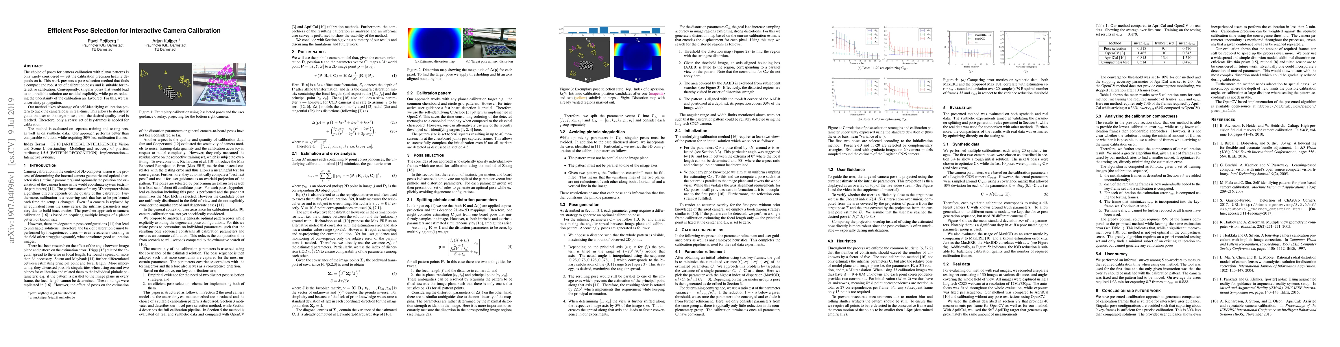 This paper proposes an efficient pose selection method for interactive camera calibration using planar patterns, which optimizes calibration precision by avoiding singular poses and favoring those that reduce uncertainty. The method employs a self-identifying pattern and real-time pose tracking to guide users to optimal poses, requiring 30% fewer calibration frames than comparable solutions.