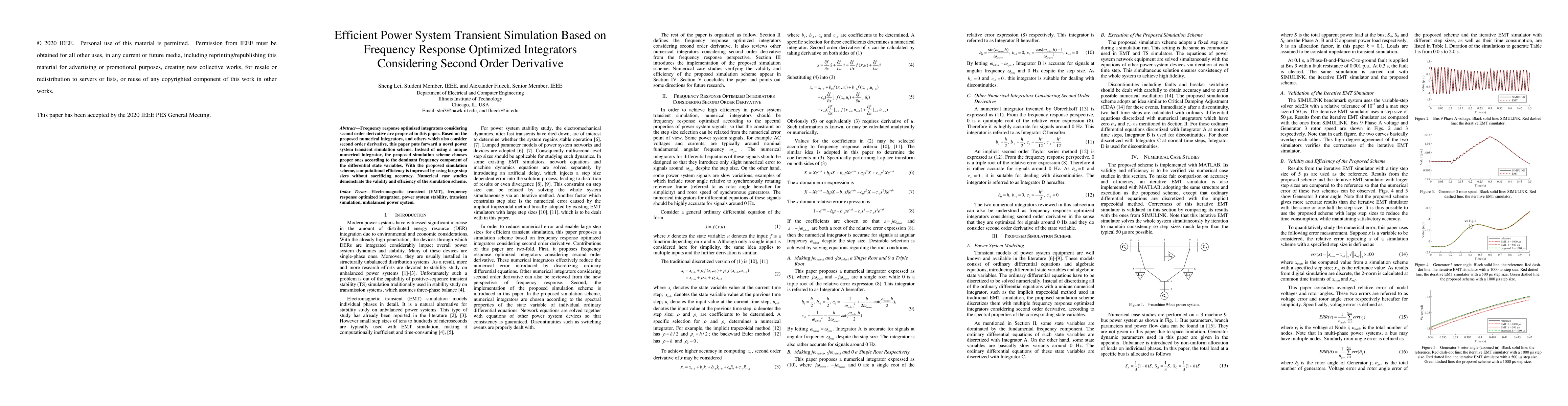Frequency response optimized integrators considering second order derivative are proposed in this paper. Based on the proposed numerical integrators, and others which also consider second order derivative, this paper puts forward a novel power system transient simulation scheme. Instead of using a unique numerical integrator, the proposed simulation scheme chooses proper ones according to the dominant frequency component of the differential state variables. With the proposed simulation scheme, computational efficiency is improved by using large step sizes without sacrificing accuracy. Numerical case studies demonstrate the validity and efficiency of the simulation scheme.