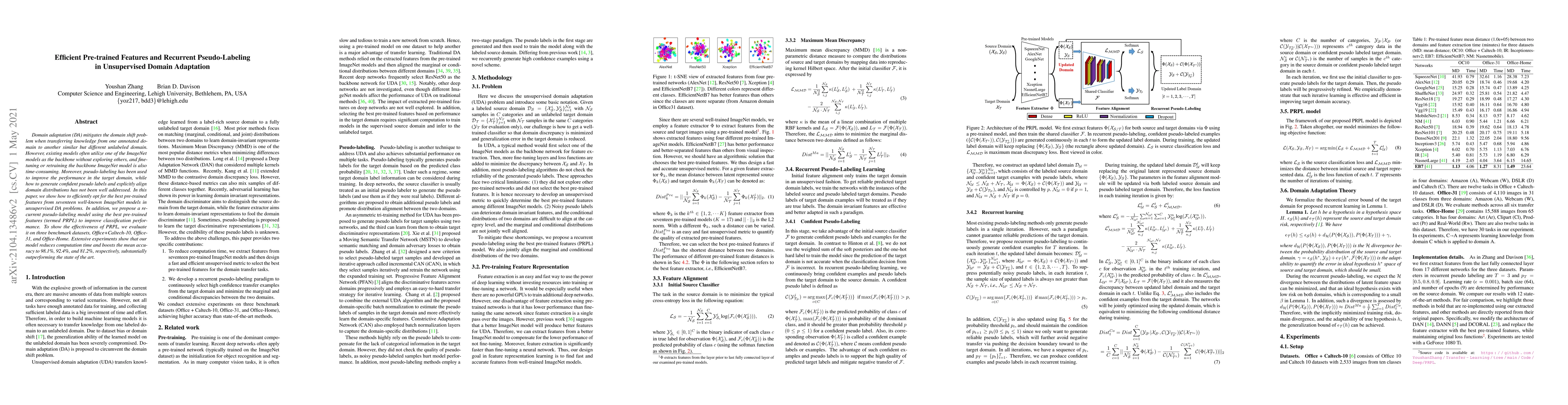 This paper proposes an efficient method for unsupervised domain adaptation by selecting the best pre-trained features from seventeen ImageNet models and introducing a recurrent pseudo-labeling model (PRPL) to generate confident pseudo labels. The method significantly reduces computation time and achieves superior classification performance on three benchmark datasets.