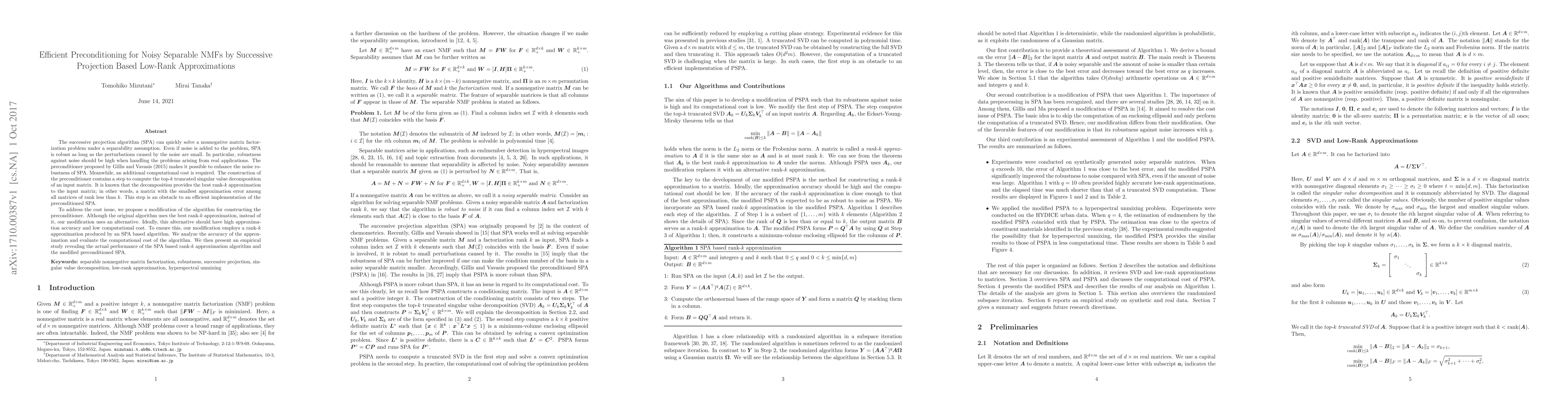 The successive projection algorithm (SPA) can quickly solve a nonnegative matrix factorization problem under a separability assumption. Even if noise is added to the problem, SPA is robust as long as the perturbations caused by the noise are small. In particular, robustness against noise should be high when handling the problems arising from real applications. The preconditioner proposed by Gillis and Vavasis (2015) makes it possible to enhance the noise robustness of SPA. Meanwhile, an additional computational cost is required. The construction of the preconditioner contains a step to compute the top-$k$ truncated singular value decomposition of an input matrix. It is known that the decomposition provides the best rank-$k$ approximation to the input matrix; in other words, a matrix with the smallest approximation error among all matrices of rank less than $k$. This step is an obstacle to an efficient implementation of the preconditioned SPA. To address the cost issue, we propose a modification of the algorithm for constructing the preconditioner. Although the original algorithm uses the best rank-$k$ approximation, instead of it, our modification uses an alternative. Ideally, this alternative should have high approximation accuracy and low computational cost. To ensure this, our modification employs a rank-$k$ approximation produced by an SPA based algorithm. We analyze the accuracy of the approximation and evaluate the computational cost of the algorithm. We then present an empirical study revealing the actual performance of the SPA based rank-$k$ approximation algorithm and the modified preconditioned SPA.