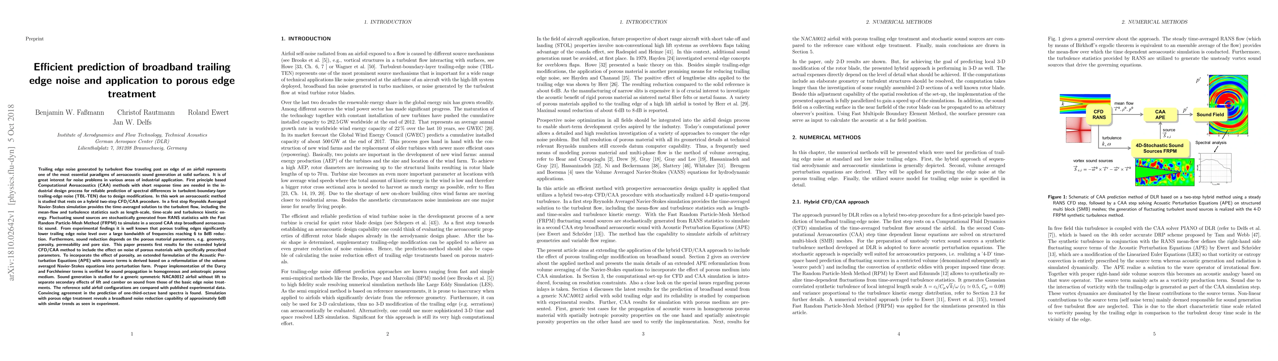 This paper proposes a hybrid CFD/CAA method for efficient prediction of broadband trailing edge noise from turbulent flow around airfoils, incorporating porous edge treatments. The method uses RANS simulations for mean-flow and turbulence statistics, followed by stochastic generation of fluctuating sound sources via the Fast Random Particle-Mesh Method. The study also introduces an extended formulation of the Acoustic Perturbation Equations to model sound propagation in porous materials, demonstrating potential for up to 8dB noise reduction.