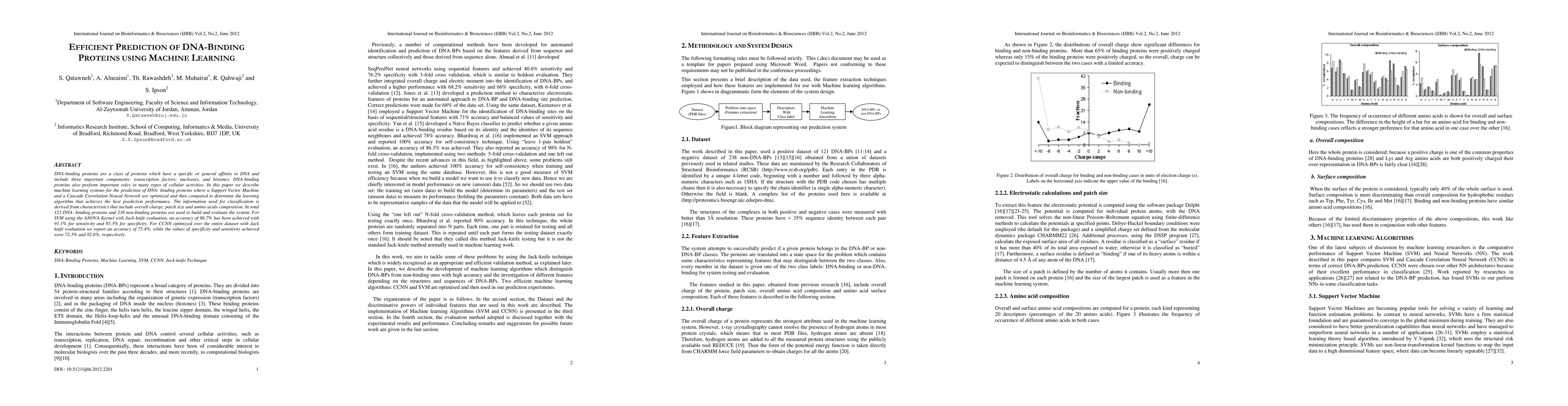 This paper presents machine learning models, specifically a Support Vector Machine (SVM) and a Cascade Correlation Neural Network (CCNN), for predicting DNA-binding proteins. The SVM achieved higher accuracy (86.7%) with better sensitivity (91.1%) and specificity (85.3%) compared to the CCNN (75.4% accuracy).