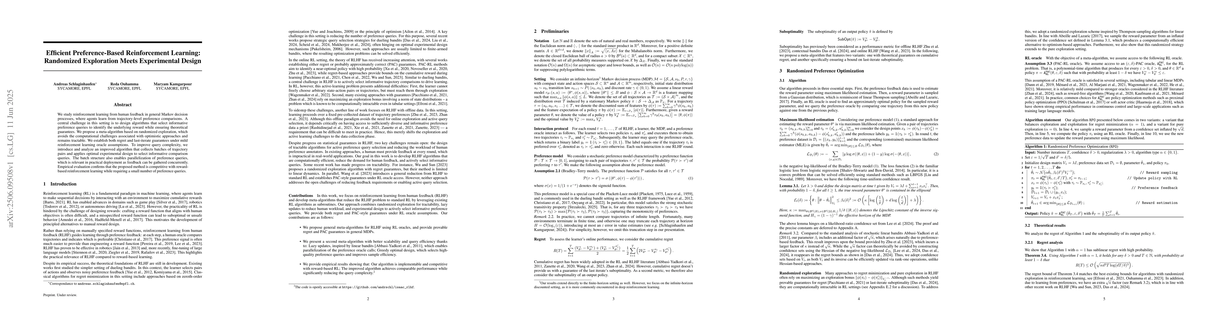 We study reinforcement learning from human feedback in general Markov decision processes, where agents learn from trajectory-level preference comparisons. A central challenge in this setting is to design algorithms that select informative preference queries to identify the underlying reward while ensuring theoretical guarantees. We propose a meta-algorithm based on randomized exploration, which avoids the computational challenges associated with optimistic approaches and remains tractable. We establish both regret and last-iterate guarantees under mild reinforcement learning oracle assumptions. To improve query complexity, we introduce and analyze an improved algorithm that collects batches of trajectory pairs and applies optimal experimental design to select informative comparison queries. The batch structure also enables parallelization of preference queries, which is relevant in practical deployment as feedback can be gathered concurrently. Empirical evaluation confirms that the proposed method is competitive with reward-based reinforcement learning while requiring a small number of preference queries.