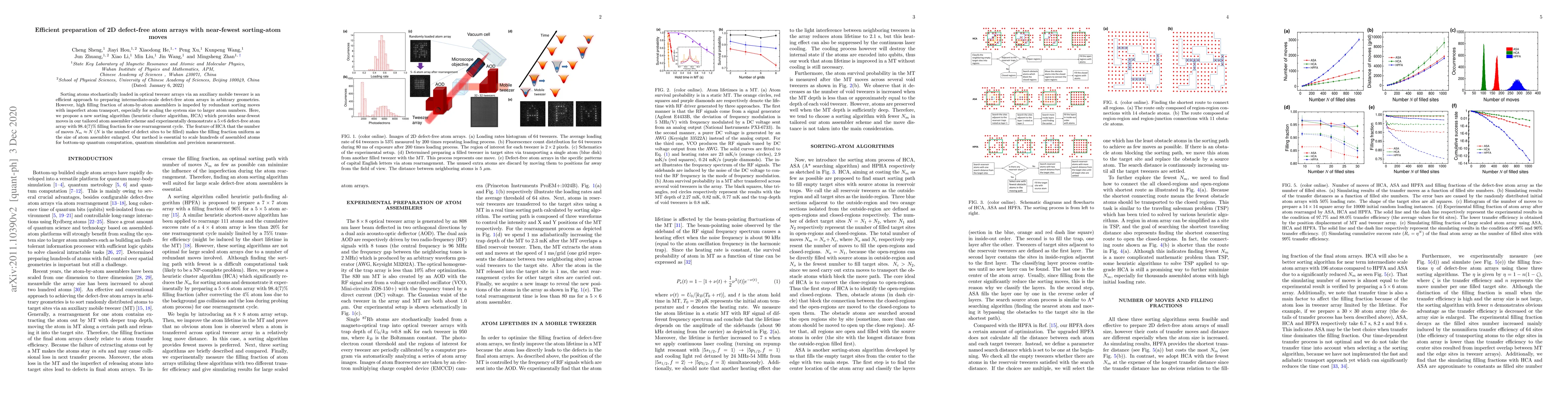 This paper proposes a new sorting algorithm called the Heuristic Cluster Algorithm (HCA) to efficiently prepare defect-free 2D atom arrays with minimal sorting moves, achieving a 98.4(7)% filling fraction in a $5\times6$ array in a single cycle. The HCA algorithm maintains a uniform filling fraction as system size increases, aiding in scaling for quantum computation and simulation.