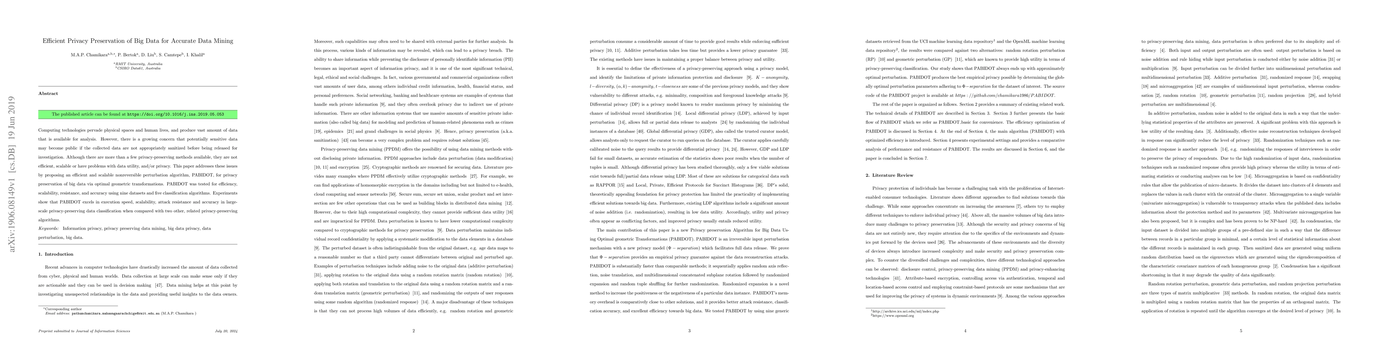 This paper proposes PABIDOT, an efficient and scalable nonreversible perturbation algorithm for preserving privacy in big data through optimal geometric transformations. Experimental results demonstrate that PABIDOT outperforms other methods in execution speed, scalability, attack resistance, and accuracy in large-scale data classification.