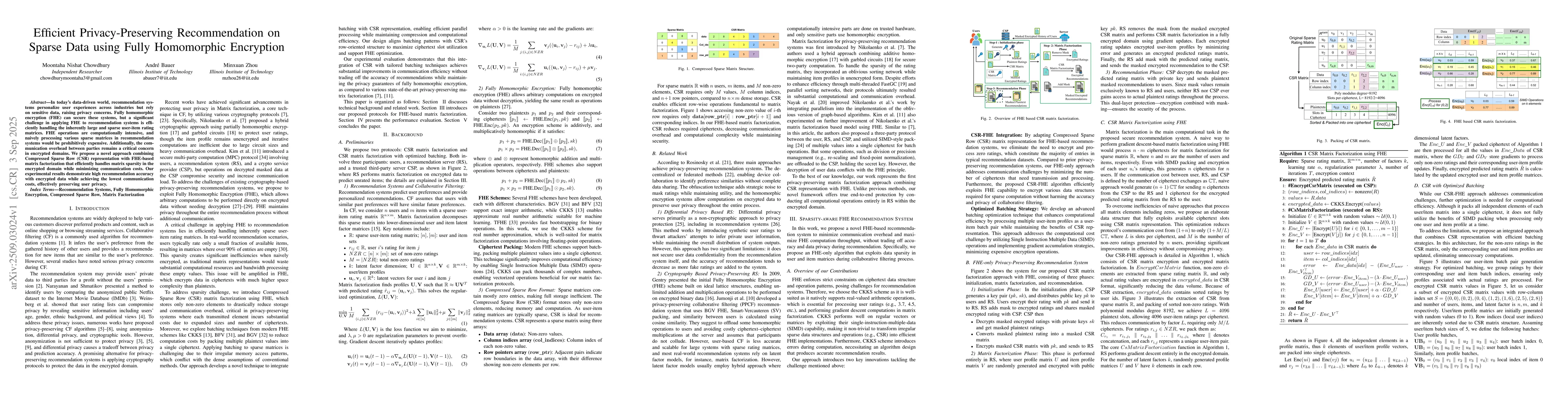 In today's data-driven world, recommendation systems personalize user experiences across industries but rely on sensitive data, raising privacy concerns. Fully homomorphic encryption (FHE) can secure these systems, but a significant challenge in applying FHE to recommendation systems is efficiently handling the inherently large and sparse user-item rating matrices. FHE operations are computationally intensive, and naively processing various sparse matrices in recommendation systems would be prohibitively expensive. Additionally, the communication overhead between parties remains a critical concern in encrypted domains. We propose a novel approach combining Compressed Sparse Row (CSR) representation with FHE-based matrix factorization that efficiently handles matrix sparsity in the encrypted domain while minimizing communication costs. Our experimental results demonstrate high recommendation accuracy with encrypted data while achieving the lowest communication costs, effectively preserving user privacy.