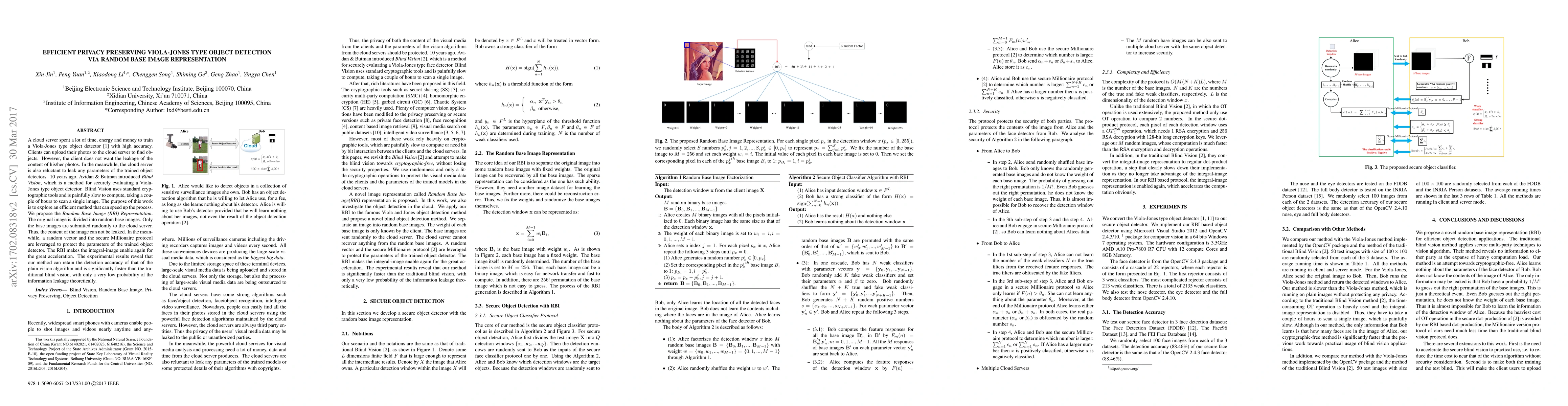 A cloud server spent a lot of time, energy and money to train a Viola-Jones type object detector with high accuracy. Clients can upload their photos to the cloud server to find objects. However, the client does not want the leakage of the content of his/her photos. In the meanwhile, the cloud server is also reluctant to leak any parameters of the trained object detectors. 10 years ago, Avidan & Butman introduced Blind Vision, which is a method for securely evaluating a Viola-Jones type object detector. Blind Vision uses standard cryptographic tools and is painfully slow to compute, taking a couple of hours to scan a single image. The purpose of this work is to explore an efficient method that can speed up the process. We propose the Random Base Image (RBI) Representation. The original image is divided into random base images. Only the base images are submitted randomly to the cloud server. Thus, the content of the image can not be leaked. In the meanwhile, a random vector and the secure Millionaire protocol are leveraged to protect the parameters of the trained object detector. The RBI makes the integral-image enable again for the great acceleration. The experimental results reveal that our method can retain the detection accuracy of that of the plain vision algorithm and is significantly faster than the traditional blind vision, with only a very low probability of the information leakage theoretically.