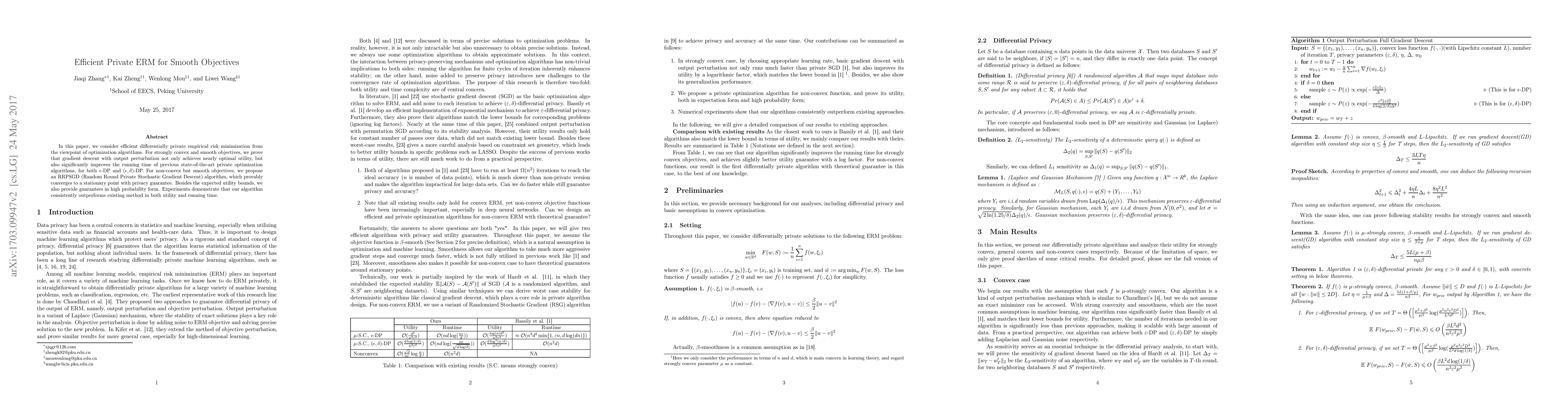 This paper presents an efficient differentially private empirical risk minimization algorithm for smooth objectives, showing that gradient descent with output perturbation significantly enhances running time and utility compared to previous methods. For non-convex smooth objectives, it introduces an RRPSGD algorithm that guarantees convergence to a stationary point with privacy, outperforming existing methods in both utility and speed.