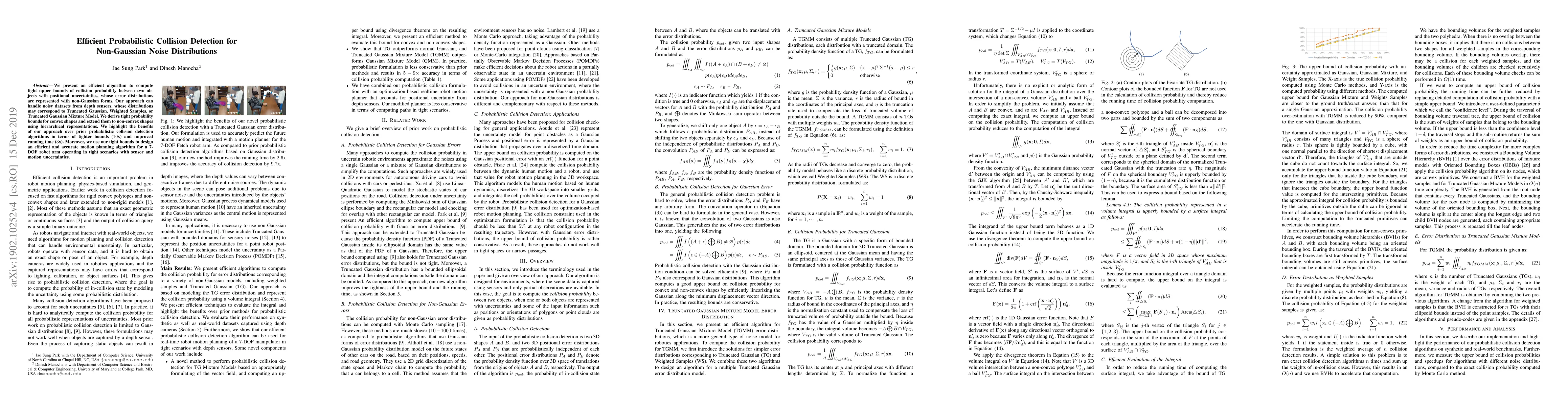 We present an efficient algorithm to compute tight upper bounds of collision probability between two objects with positional uncertainties, whose error distributions are represented with non-Gaussian forms. Our approach can handle noisy datasets from depth sensors, whose distributions may correspond to Truncated Gaussian, Weighted Samples, or Truncated Gaussian Mixture Model. We derive tight probability bounds for convex shapes and extend them to non-convex shapes using hierarchical representations. We highlight the benefits of our approach over prior probabilistic collision detection algorithms in terms of tighter bounds ($10$x) and improved running time ($3$x). Moreover, we use our tight bounds to design an efficient and accurate motion planning algorithm for a 7-DOF robot arm operating in tight scenarios with sensor and motion uncertainties.
