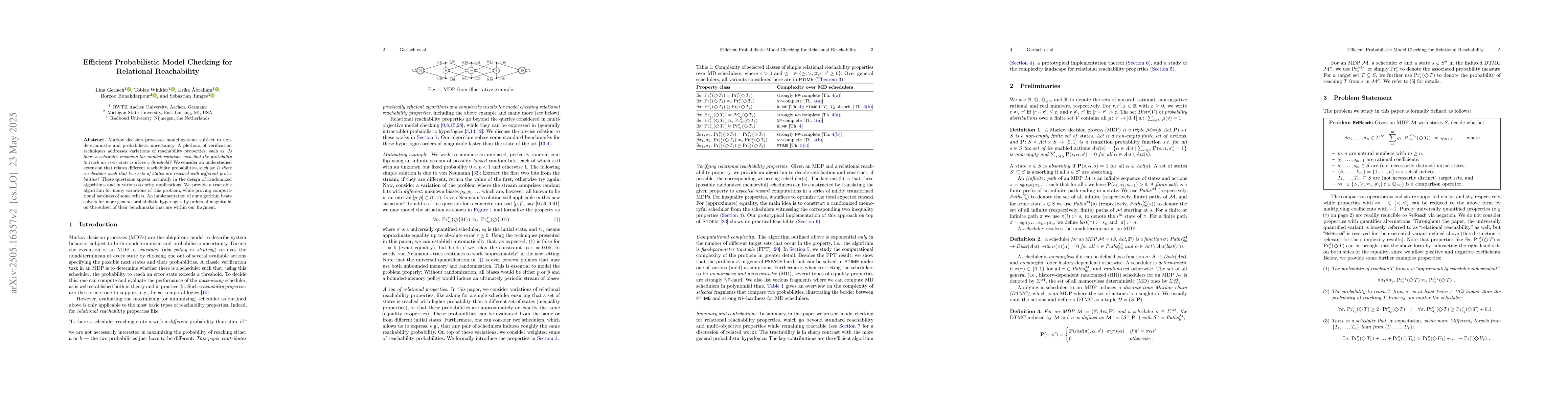 The paper presents an algorithm for efficiently checking relational reachability properties in Markov decision processes, contrasting it with more general probabilistic hyperlogics solvers.