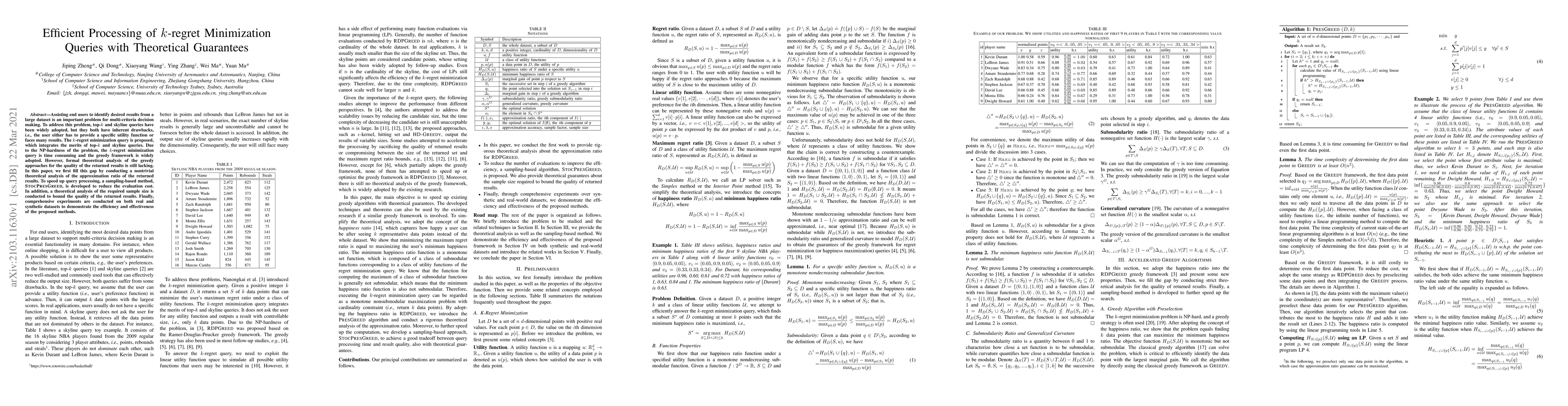 This paper proposes a k-regret minimization query to improve multi-criteria decision making by combining top-k and skyline queries. It conducts theoretical analysis to evaluate the quality of greedy approaches and introduces a sampling-based method, StocPreGreed, to speed up processing while maintaining result quality, validated through experiments on real and synthetic datasets.
