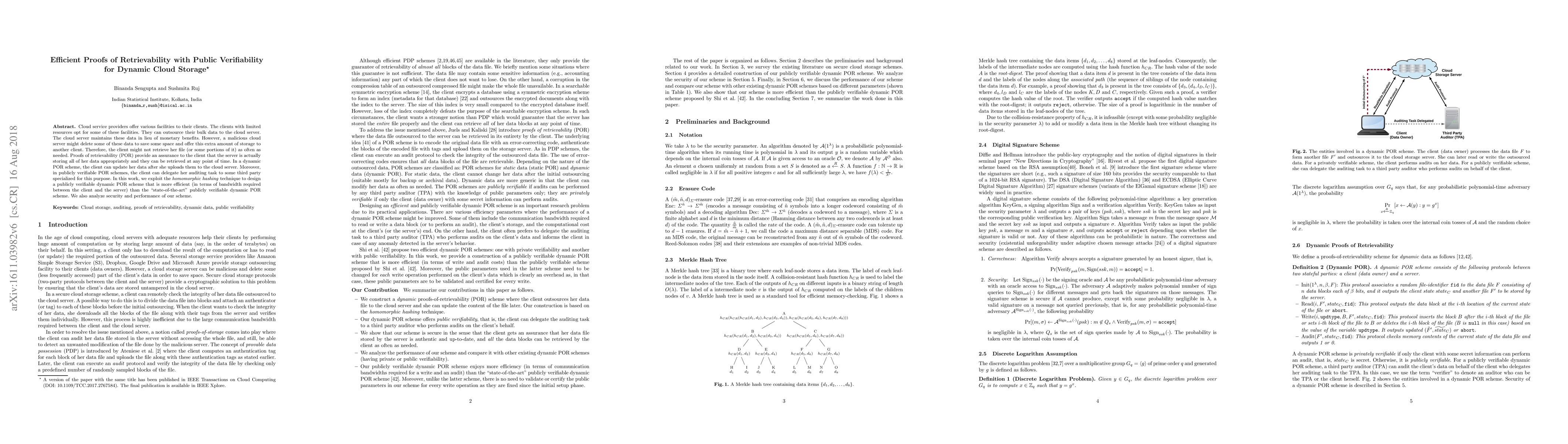 This paper proposes an efficient publicly verifiable dynamic proof of retrievability scheme for cloud storage using homomorphic hashing, aiming to reduce bandwidth usage compared to existing methods, while ensuring data integrity and allowing third-party verification. The scheme's security and performance are thoroughly analyzed.