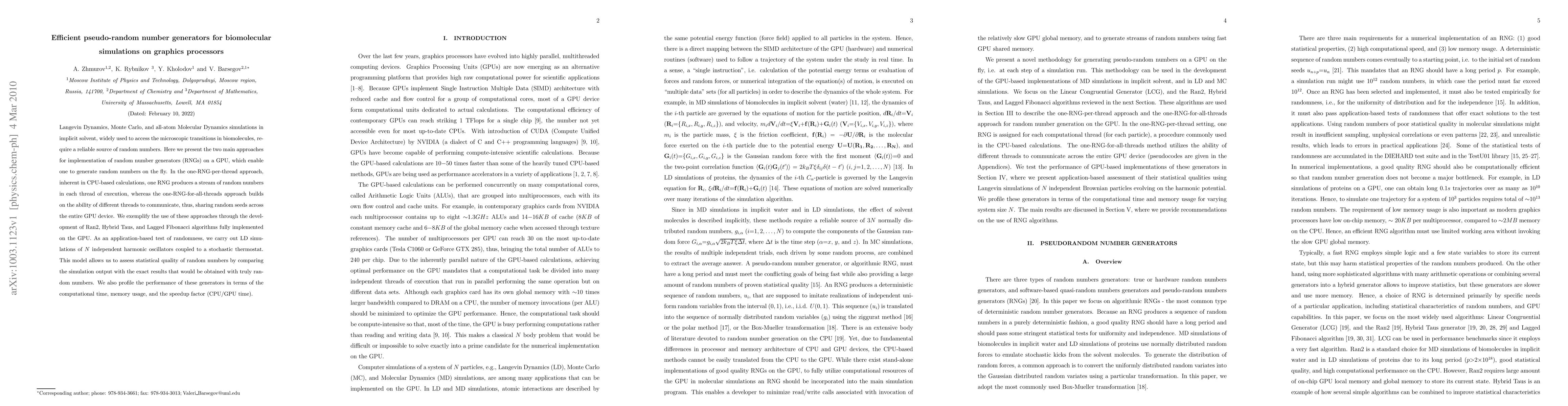 This paper presents two GPU-based approaches for implementing efficient pseudo-random number generators (RNGs) in biomolecular simulations, evaluating Ran2, Hybrid Taus, and Lagged Fibonacci algorithms. The study compares the one-RNG-per-thread and one-RNG-for-all-threads methods, assessing their statistical quality and performance in terms of computational time, memory usage, and speedup.