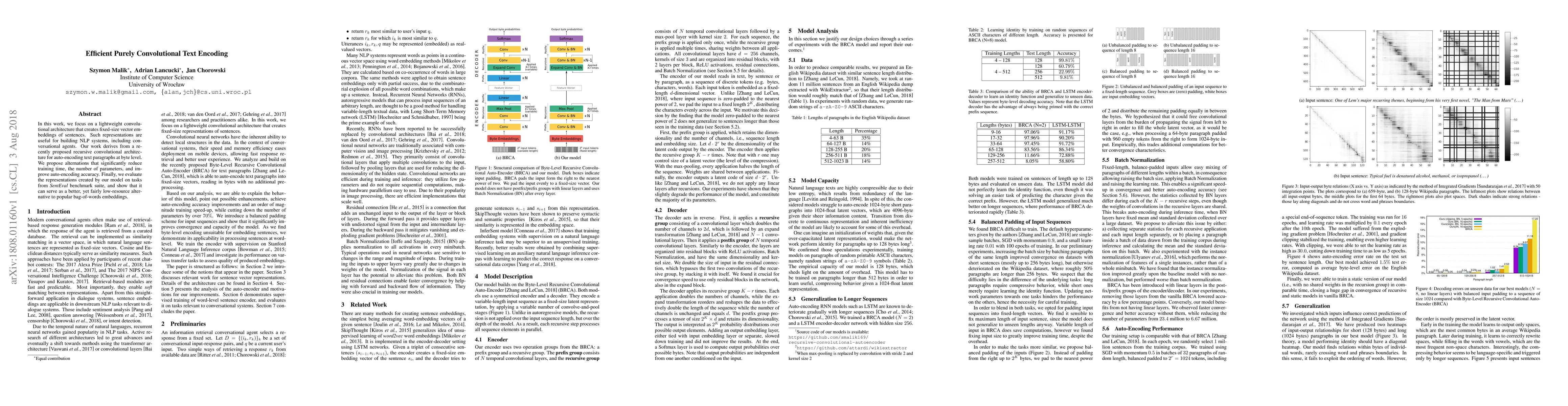In this work, we focus on a lightweight convolutional architecture that creates fixed-size vector embeddings of sentences. Such representations are useful for building NLP systems, including conversational agents. Our work derives from a recently proposed recursive convolutional architecture for auto-encoding text paragraphs at byte level. We propose alternations that significantly reduce training time, the number of parameters, and improve auto-encoding accuracy. Finally, we evaluate the representations created by our model on tasks from SentEval benchmark suite, and show that it can serve as a better, yet fairly low-resource alternative to popular bag-of-words embeddings.