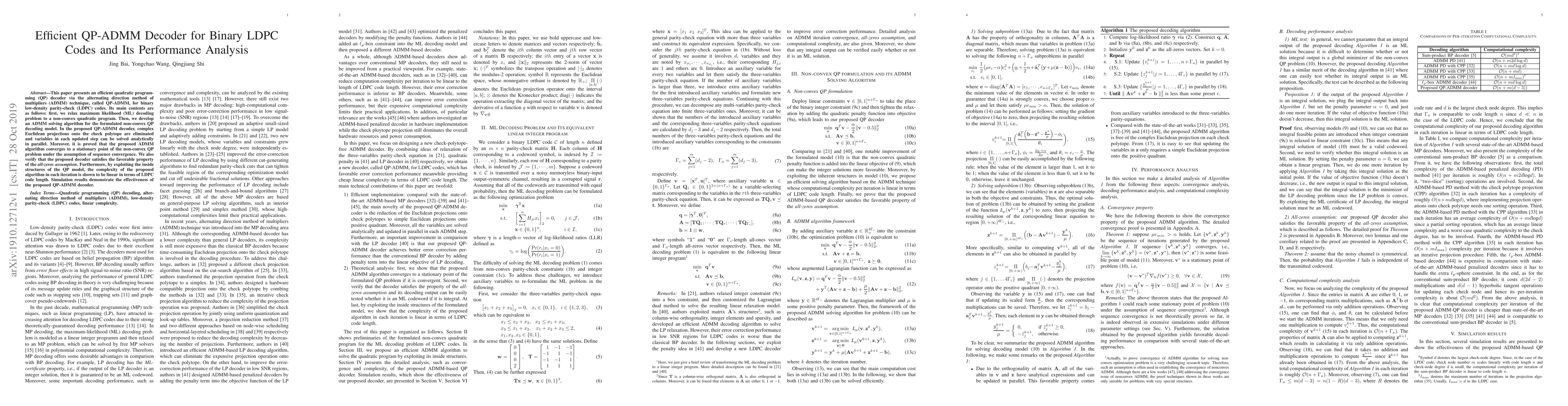 This paper introduces an efficient QP-ADMM decoder for binary LDPC codes, which solves a relaxed non-convex quadratic programming problem using the ADMM technique. The proposed method achieves linear complexity and demonstrates effective performance through simulations.