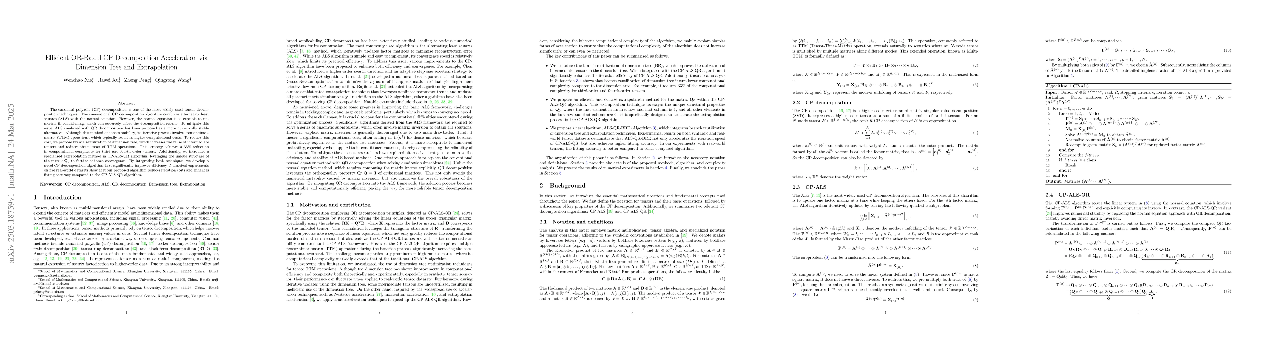 This paper proposes an efficient CP decomposition algorithm using QR-based ALS with dimension tree reutilization and extrapolation to reduce computational costs and improve convergence. The method achieves a 33% reduction in complexity and enhances fitting accuracy on real-world datasets.