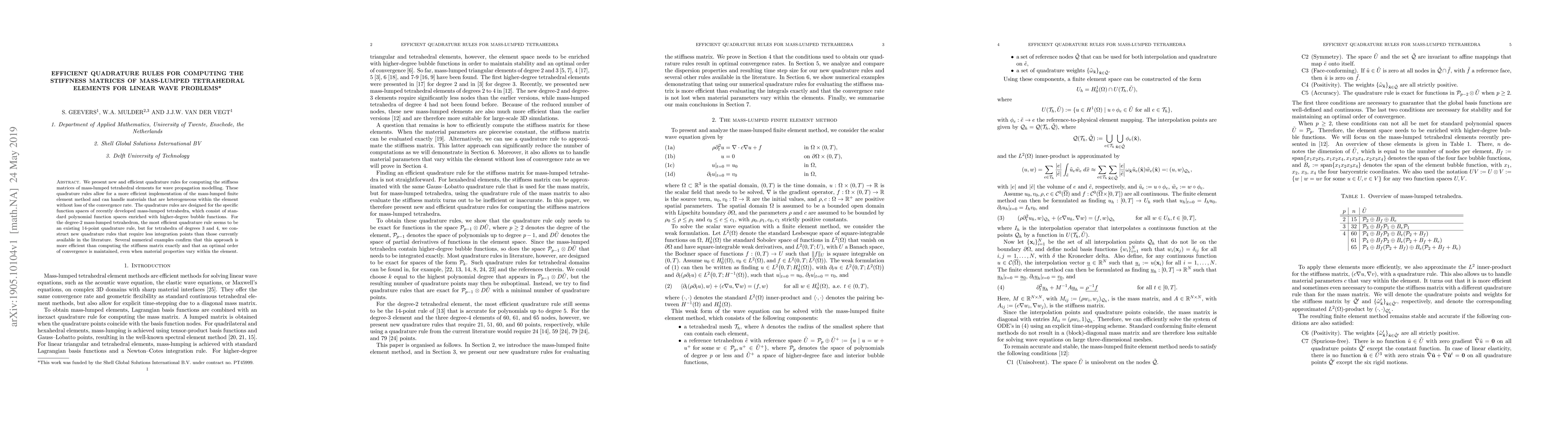 This paper introduces efficient quadrature rules for calculating the stiffness matrices of mass-lumped tetrahedral elements used in wave propagation models. The new rules require fewer integration points than existing methods, maintain convergence rates, and handle heterogeneous materials within elements effectively.