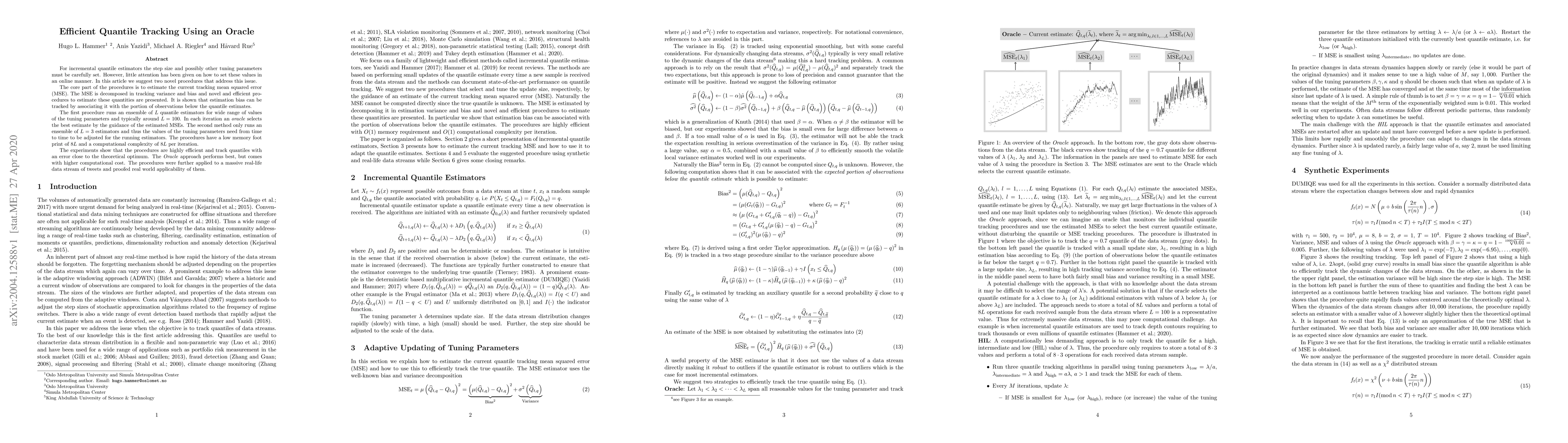 For incremental quantile estimators the step size and possibly other tuning parameters must be carefully set. However, little attention has been given on how to set these values in an online manner. In this article we suggest two novel procedures that address this issue. The core part of the procedures is to estimate the current tracking mean squared error (MSE). The MSE is decomposed in tracking variance and bias and novel and efficient procedures to estimate these quantities are presented. It is shown that estimation bias can be tracked by associating it with the portion of observations below the quantile estimates. The first procedure runs an ensemble of $L$ quantile estimators for wide range of values of the tuning parameters and typically around $L = 100$. In each iteration an oracle selects the best estimate by the guidance of the estimated MSEs. The second method only runs an ensemble of $L = 3$ estimators and thus the values of the tuning parameters need from time to time to be adjusted for the running estimators. The procedures have a low memory foot print of $8L$ and a computational complexity of $8L$ per iteration. The experiments show that the procedures are highly efficient and track quantiles with an error close to the theoretical optimum. The Oracle approach performs best, but comes with higher computational cost. The procedures were further applied to a massive real-life data stream of tweets and proofed real world applicability of them.