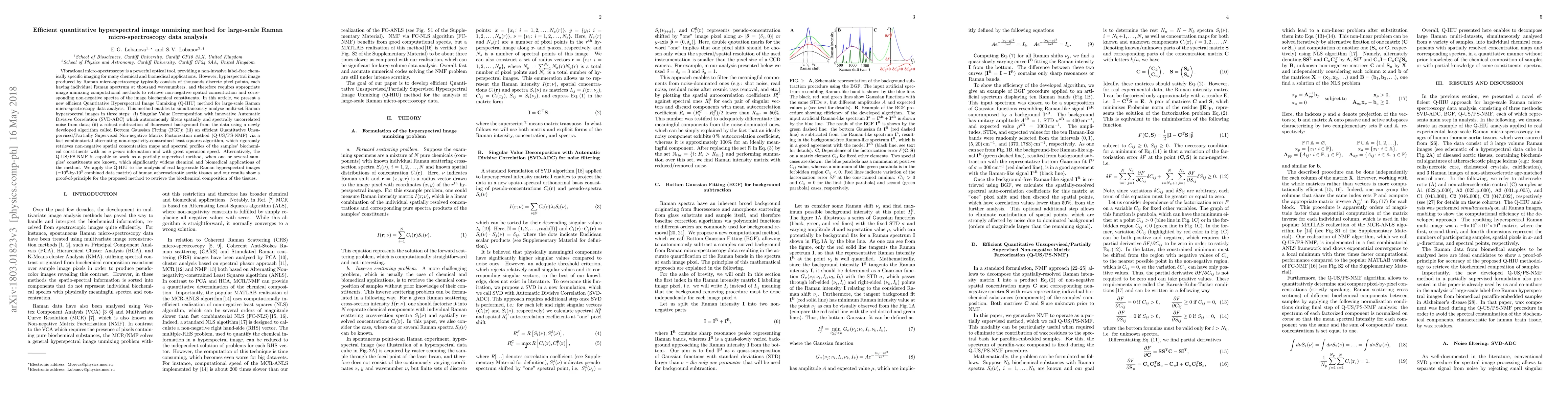 Vibrational micro-spectroscopy is a powerful optical tool, providing a non-invasive label-free chemically specific imaging for many chemical and biomedical applications. However, hyperspectral image produced by Raman micro-spectroscopy typically consists of thousands discrete pixel points, each having individual Raman spectrum at thousand wavenumbers, and therefore requires appropriate image unmixing computational methods to retrieve non-negative spatial concentration and corresponding non-negative spectra of the image biochemical constituents. In this article, we present a new efficient Quantitative Hyperspectral Image Unmixing (Q-HIU) method for large-scale Raman micro-spectroscopy data analysis. This method enables to simultaneously analyse multi-set Raman hyperspectral images in three steps: (i) Singular Value Decomposition with innovative Automatic Divisive Correlation (SVD-ADC) which autonomously filters spatially and spectrally uncorrelated noise from data; (ii) a robust subtraction of fluorescent background from the data using a newly developed algorithm called Bottom Gaussian Fitting (BGF); (iii) an efficient Quantitative Unsupervised/Partially Supervised Non-negative Matrix Factorization method (Q-US/PS-NMF), which rigorously retrieves non-negative spatial concentration maps and spectral profiles of the samples' biochemical constituents with no a priori information and with great operation speed. Alternatively, the Q-US/PS-NMF is capable to work as a partially supervised method, when one or several samples' constituents are known, which significantly widens chemical and biomedical applications of the method. We apply the Q-HIU to the analysis of real large-scale Raman hyperspectral images of human atherosclerotic aortic tissues and our results show a proof-of-principle for the proposed method to retrieve the biochemical composition of the tissues.