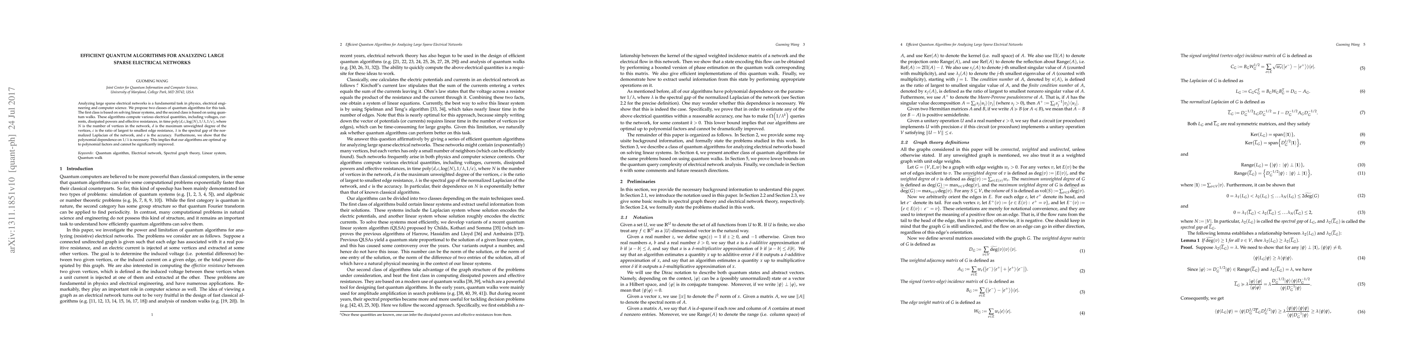 The paper presents two efficient quantum algorithms for analyzing large sparse electrical networks, computing quantities like voltages, currents, and resistances. These algorithms' runtime is polynomial in key network parameters, proven optimal up to polynomial factors, addressing a significant challenge in physics, engineering, and computer science.