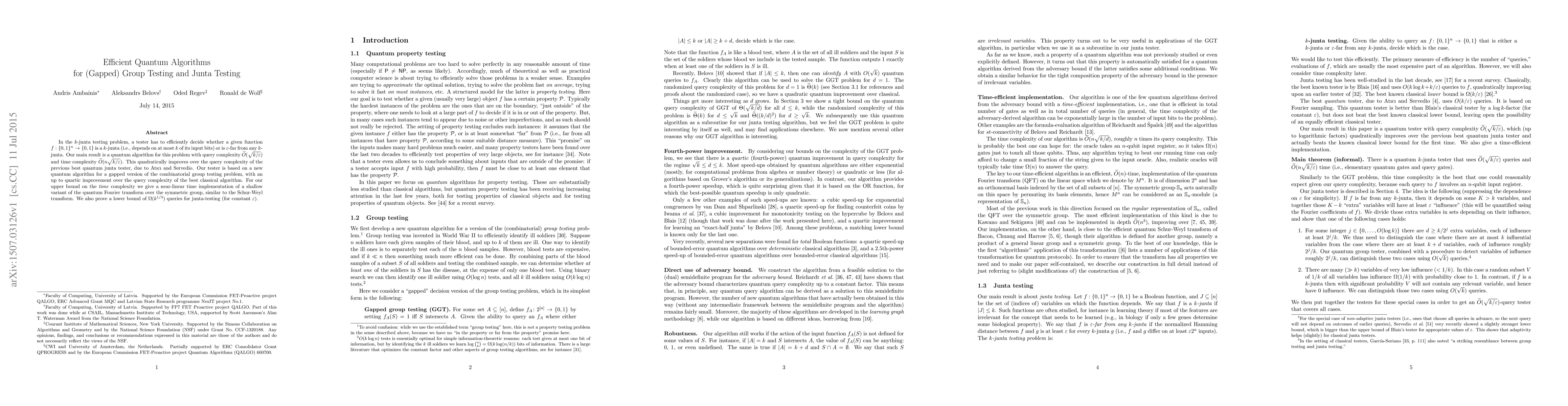 This paper presents a quantum algorithm that significantly improves the efficiency of $k$-junta testing and gapped group testing, achieving a query complexity of $\tilde O(\sqrt{k/\epsilon})$ and a time complexity of $\tilde O(n\sqrt{k/\epsilon})$, outperforming previous methods. The improvement is based on a new quantum approach to group testing with reduced query complexity.