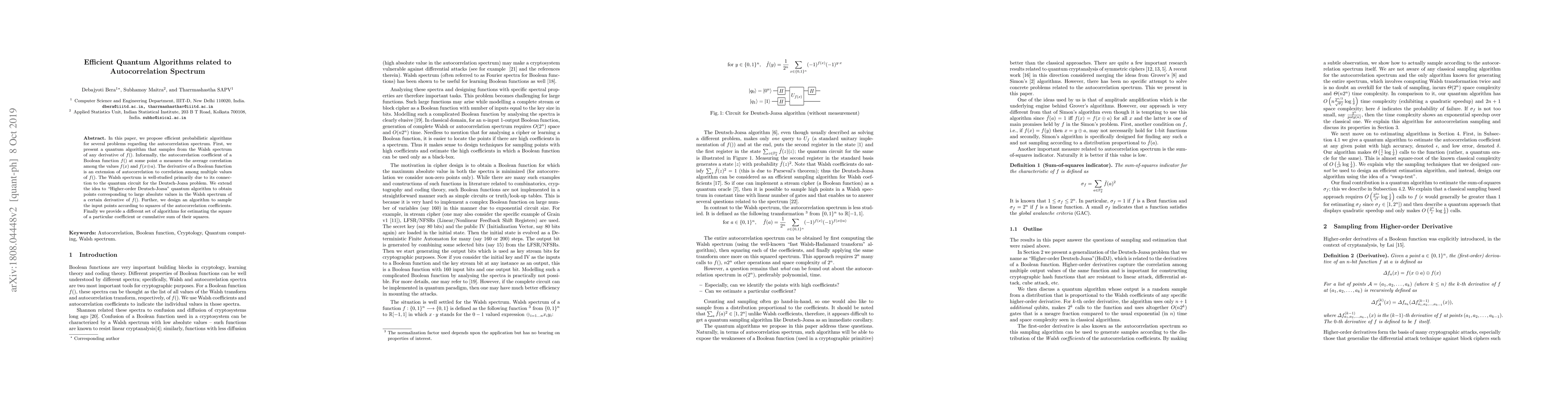 In this paper, we propose efficient probabilistic algorithms for several problems regarding the autocorrelation spectrum. First, we present a quantum algorithm that samples from the Walsh spectrum of any derivative of $f()$. Informally, the autocorrelation coefficient of a Boolean function $f()$ at some point $a$ measures the average correlation among the values $f(x)$ and $f(x \oplus a)$. The derivative of a Boolean function is an extension of autocorrelation to correlation among multiple values of $f()$. The Walsh spectrum is well-studied primarily due to its connection to the quantum circuit for the Deutsch-Jozsa problem. We extend the idea to "Higher-order Deutsch-Jozsa" quantum algorithm to obtain points corresponding to large absolute values in the Walsh spectrum of a certain derivative of $f()$. Further, we design an algorithm to sample the input points according to squares of the autocorrelation coefficients. Finally we provide a different set of algorithms for estimating the square of a particular coefficient or cumulative sum of their squares.
