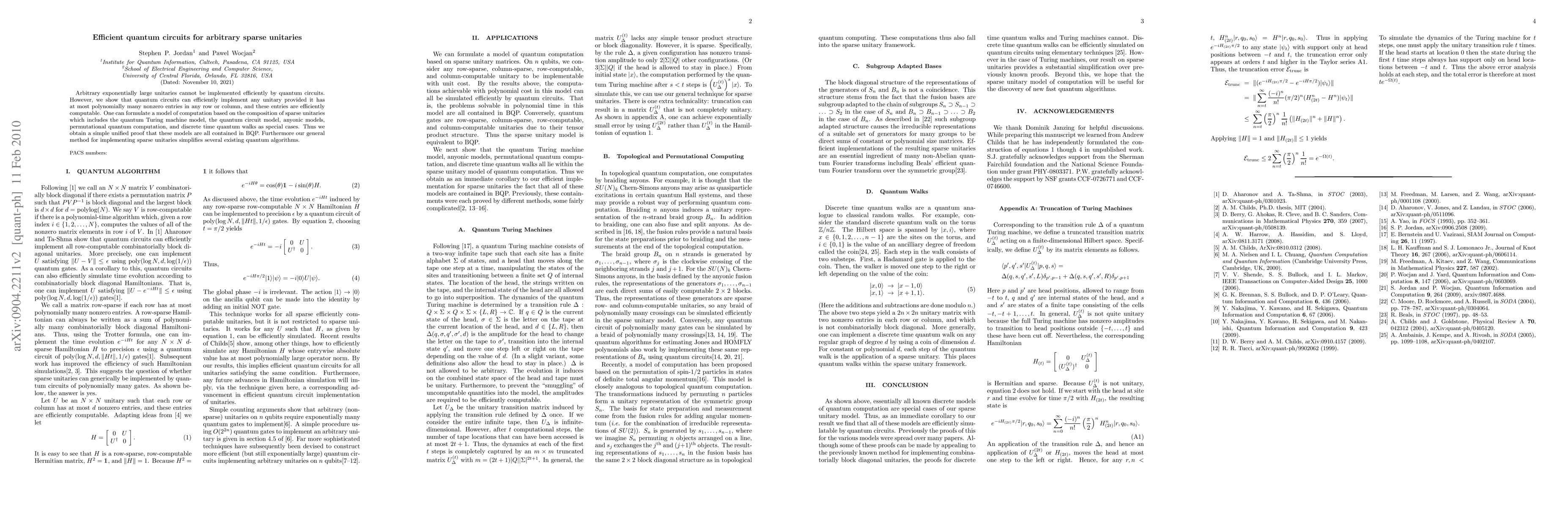 This paper demonstrates efficient quantum circuits for implementing sparse unitaries with polynomially many nonzero entries, unifying various quantum computation models under BQP. The proposed method simplifies existing quantum algorithms and extends the applicability of quantum computation to a broader class of sparse operations.
