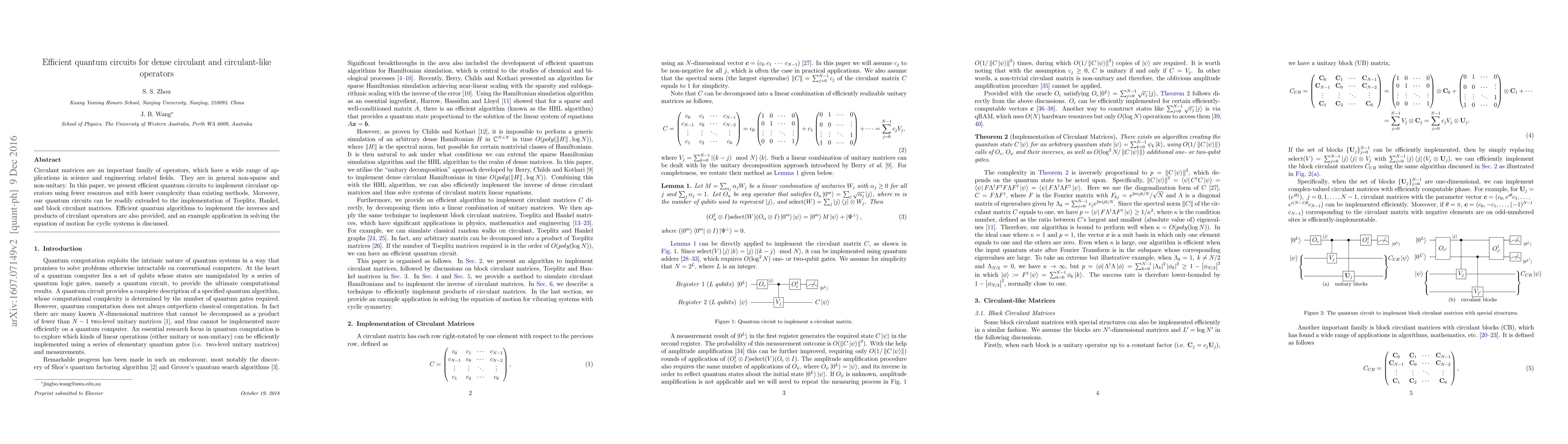 This paper introduces efficient quantum circuits for implementing circulant matrices, which are commonly non-sparse and non-unitary, reducing resource use and complexity compared to existing methods. The proposed circuits can also handle Toeplitz, Hankel, and block circulant matrices, along with algorithms for their inverses and products.