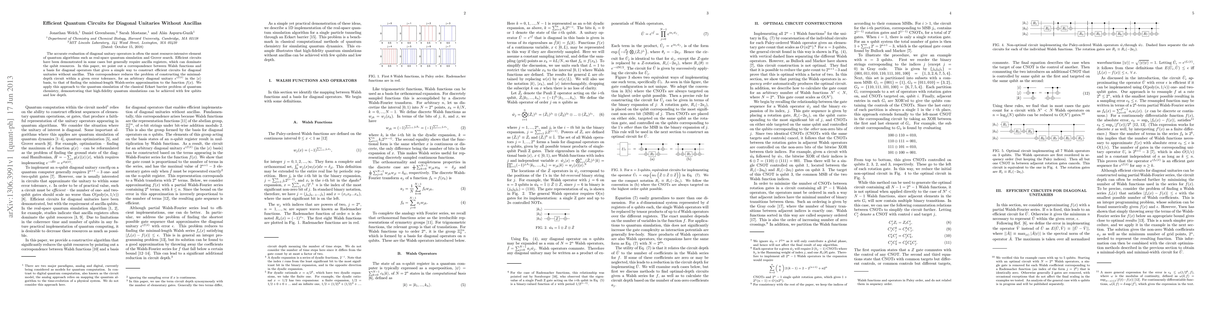 The accurate evaluation of diagonal unitary operators is often the most resource-intensive element of quantum algorithms such as real-space quantum simulation and Grover search. Efficient circuits have been demonstrated in some cases but generally require ancilla registers, which can dominate the qubit resources. In this paper, we point out a correspondence between Walsh functions and a basis for diagonal operators that gives a simple way to construct efficient circuits for diagonal unitaries without ancillas. This correspondence reduces the problem of constructing the minimal-depth circuit within a given error tolerance, for an arbitrary diagonal unitary $e^{if(\hat{x})}$ in the $|x>$ basis, to that of finding the minimal-length Walsh-series approximation to the function $f(x)$. We apply this approach to the quantum simulation of the classical Eckart barrier problem of quantum chemistry, demonstrating that high-fidelity quantum simulations can be achieved with few qubits and low depth.