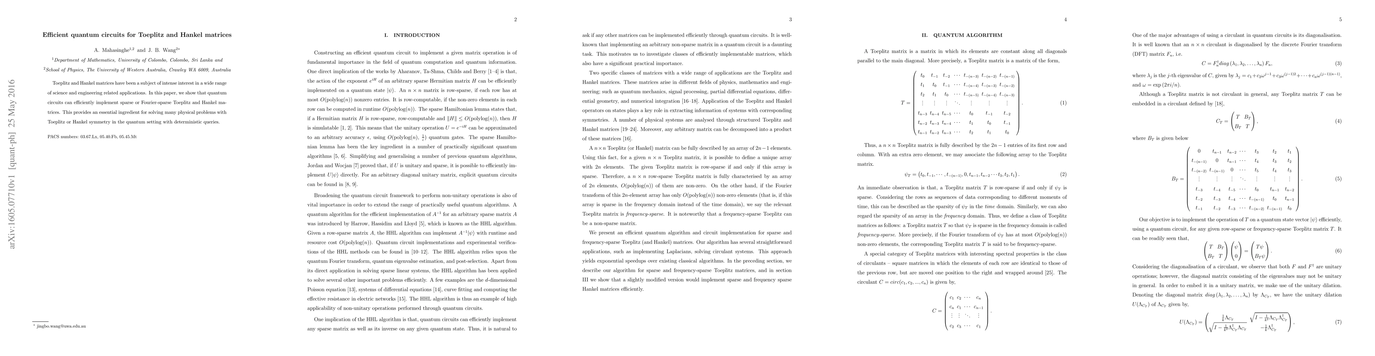 This paper demonstrates that quantum circuits can efficiently implement sparse or Fourier-sparse Toeplitz and Hankel matrices, offering a significant advancement for solving physical problems with such symmetry in quantum computing with deterministic query efficiency.