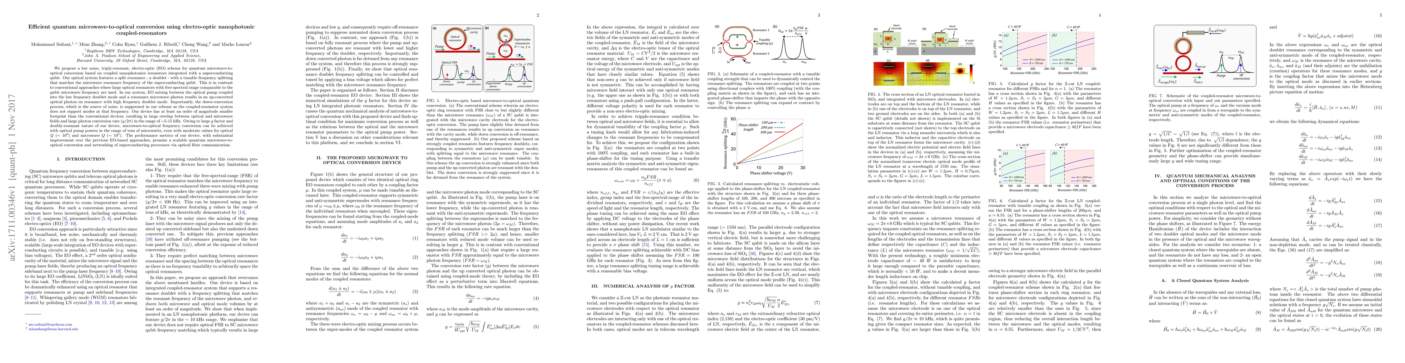 This paper proposes a low-noise, compact electro-optic scheme for quantum microwave-to-optical conversion using coupled nanophotonic resonators. The system suppresses noise through a tunable frequency splitting, achieving high conversion rates with minimal footprint and low optical pump power.