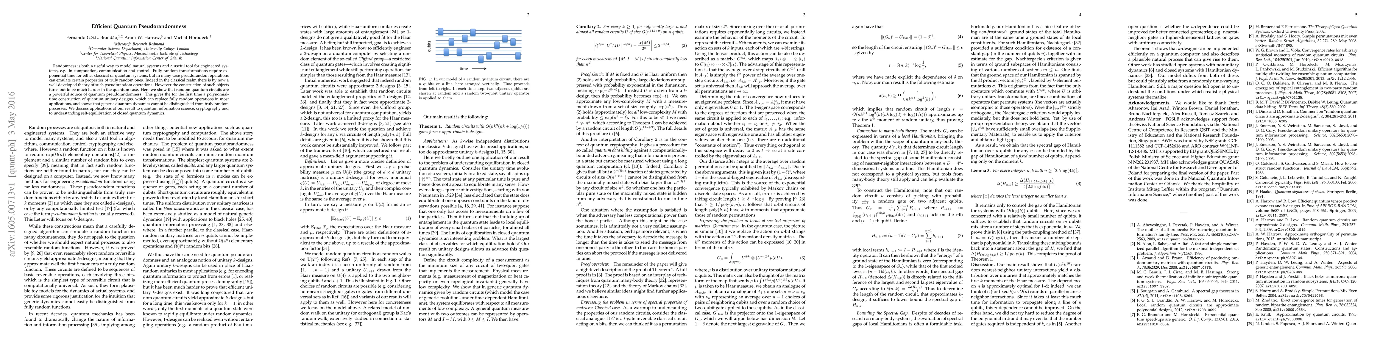 The paper proposes that random quantum circuits can serve as a source of quantum pseudorandomness, providing the first polynomial-time construction of quantum unitary designs that emulate fully random operations in most applications. The implications extend to quantum information science, cryptography, and the study of closed quantum dynamics' self-equilibration.
