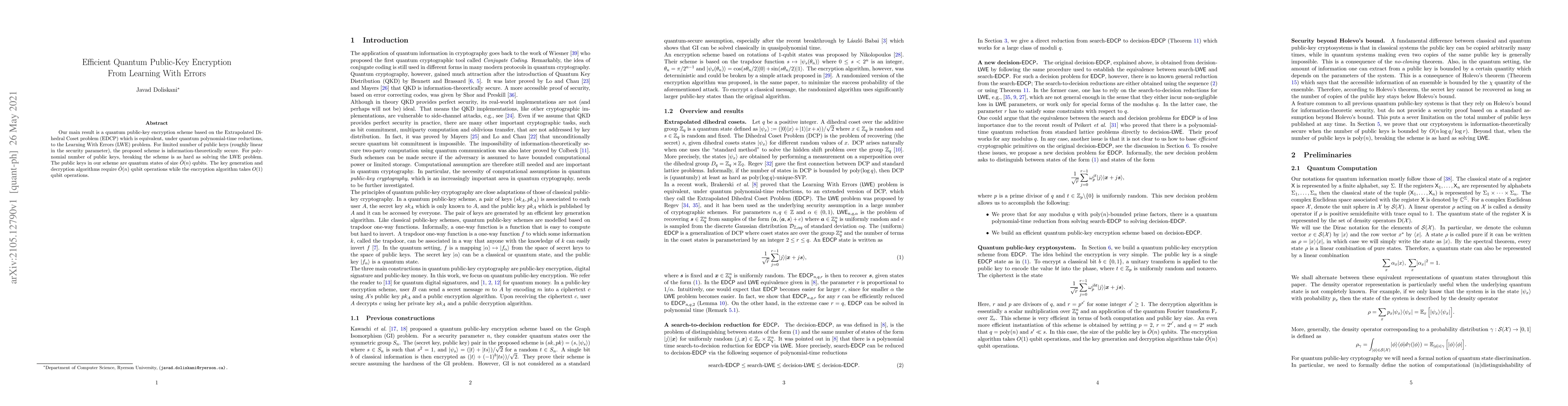This paper presents a quantum public-key encryption scheme based on the Extrapolated Dihedral Coset problem, which is equivalent to the Learning With Errors problem. The scheme is information-theoretically secure for a limited number of public keys and remains hard to break for a polynomial number of keys, akin to solving the LWE problem.